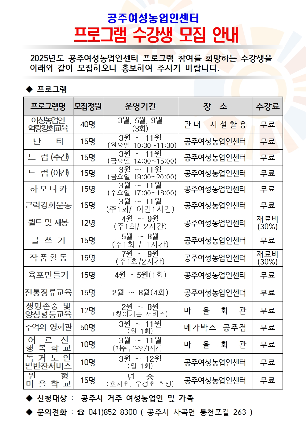 2025년 사단법인 공주 여성농업인센터 프로그램 일정 알림