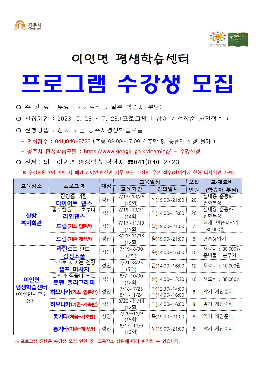 | 303 | 2023년 하반기 이인면 평생학습센터 수강생 모집 | 평생교육과 | 1,283 | 2023-06-28 | 23하반기-이인면 학습자 모집 홍보물.jpg |