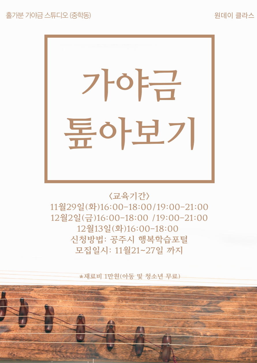 | 273 | 가야금 톺아보기 원데이 클래스 모집 | 평생교육과 | 644 | 2022-11-21 | 가야금 톺아보기 홍보지.jpg |