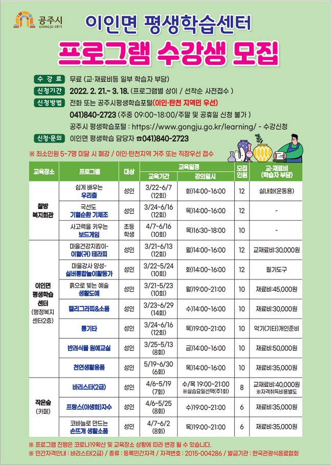 | 240 | 이인면 평생학습센터 프로그램 수강생 모집 | 평생교육과 | 958 | 2022-02-15 | (이인면)학습자 모집 홍보물.jpg |
