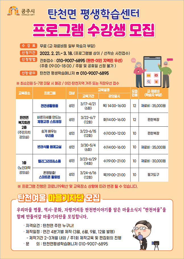 | 241 | 탄천면 평생학습센터 프로그램 수강생 모집 | 평생교육과 | 1,038 | 2022-02-18 | (탄천면)학습자 모집 홍보물.png |
