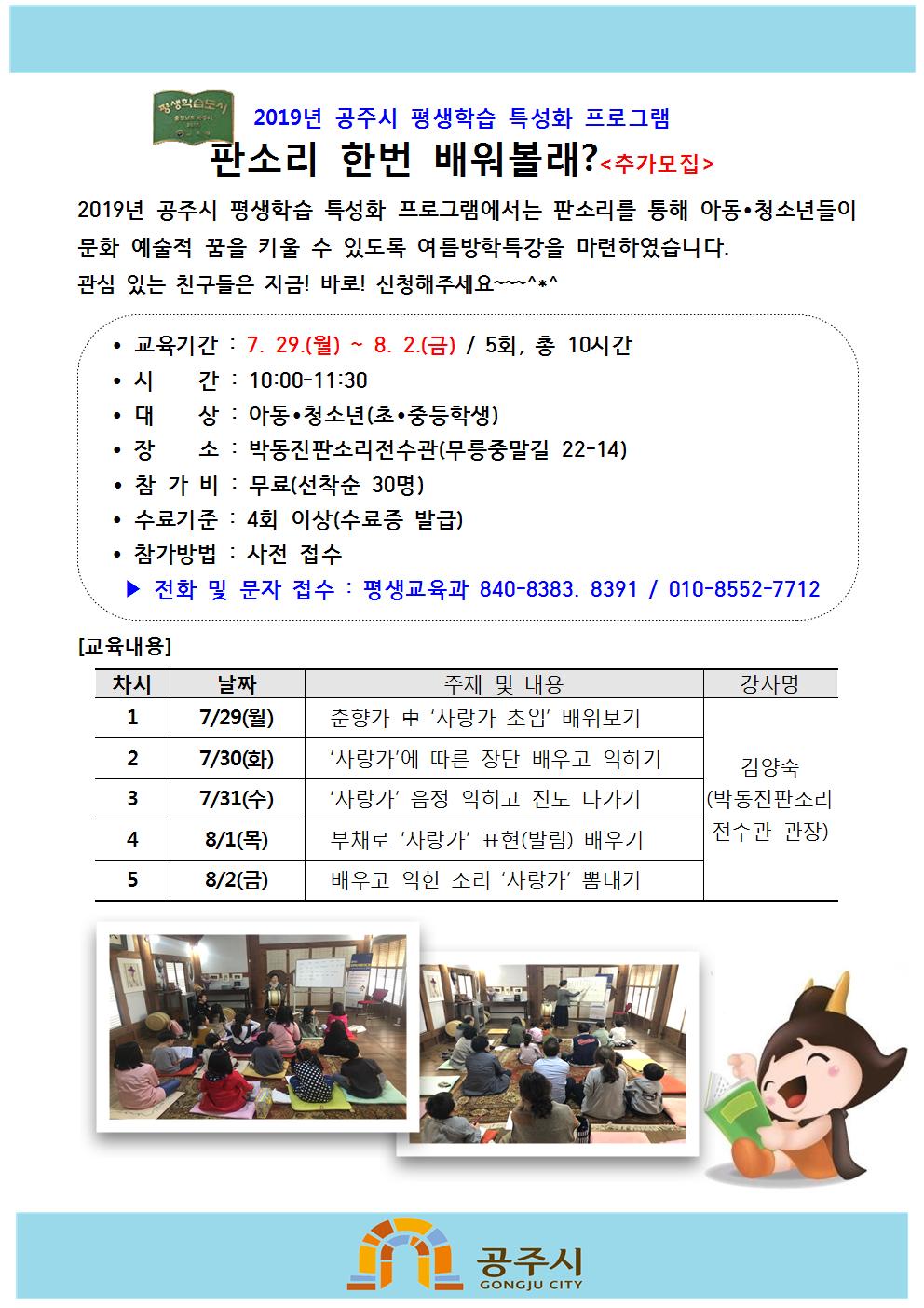 | 151 | 판소리 한번 배워볼래<추가모집> | 평생교육과 | 396 | 2019-07-25 | 판소리한번배워볼래 홍보지_추가모집001.jpg |