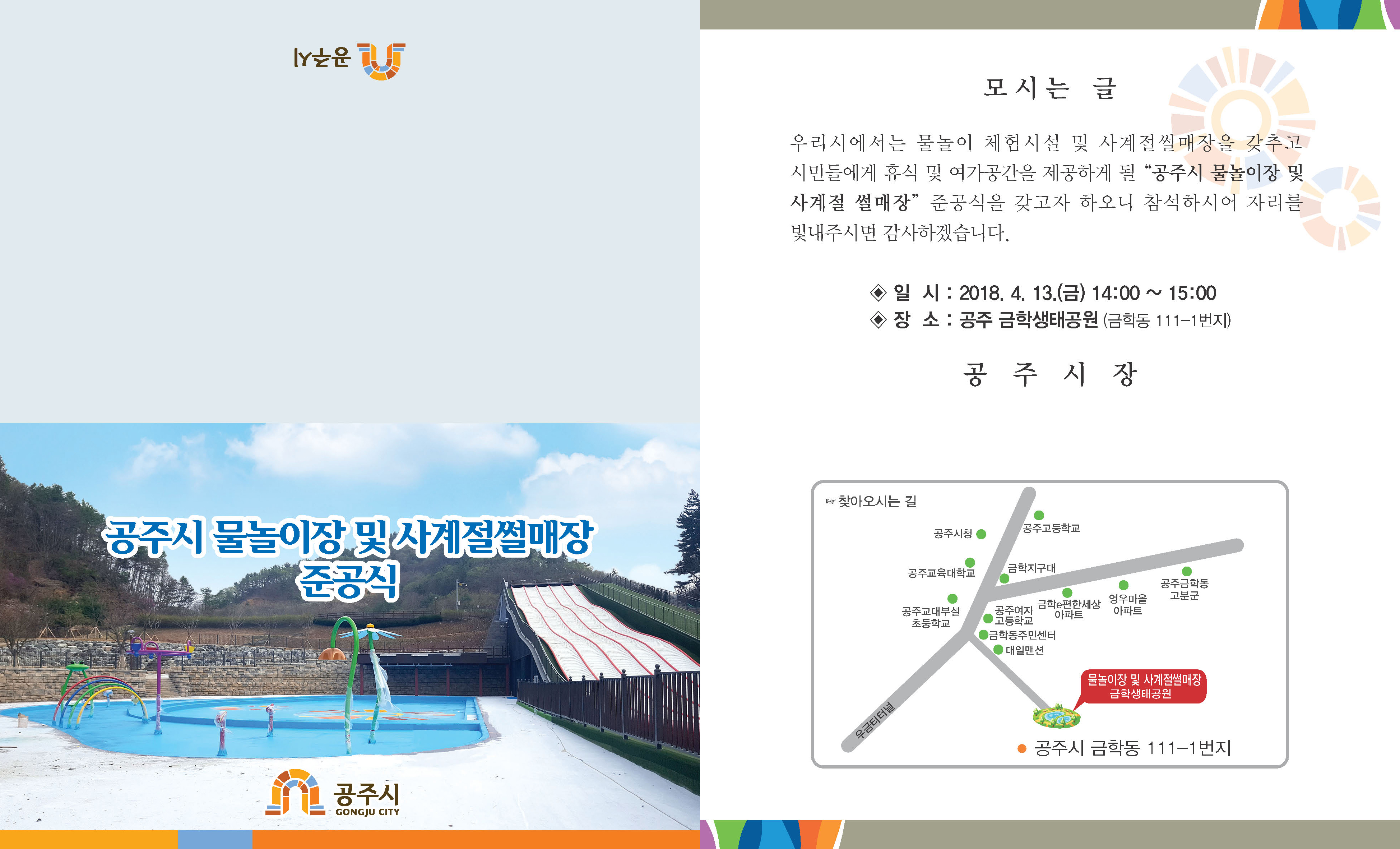 | 104 | 공주시 물놀이장 및 사계절썰매장 준공식 초대 | 교육체육과 | 694 | 2018-04-09 | 사본 -문놀이장준공식-초대장 (1).jpg |