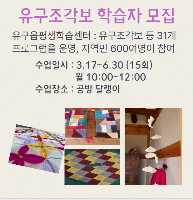 | 385 | 2025년 상반기 유구읍평생학습센터 [유구조각보] 학습자 모집 | 평생학습과 | 1,236 | 2025-02-24 | 조각보.PNG |