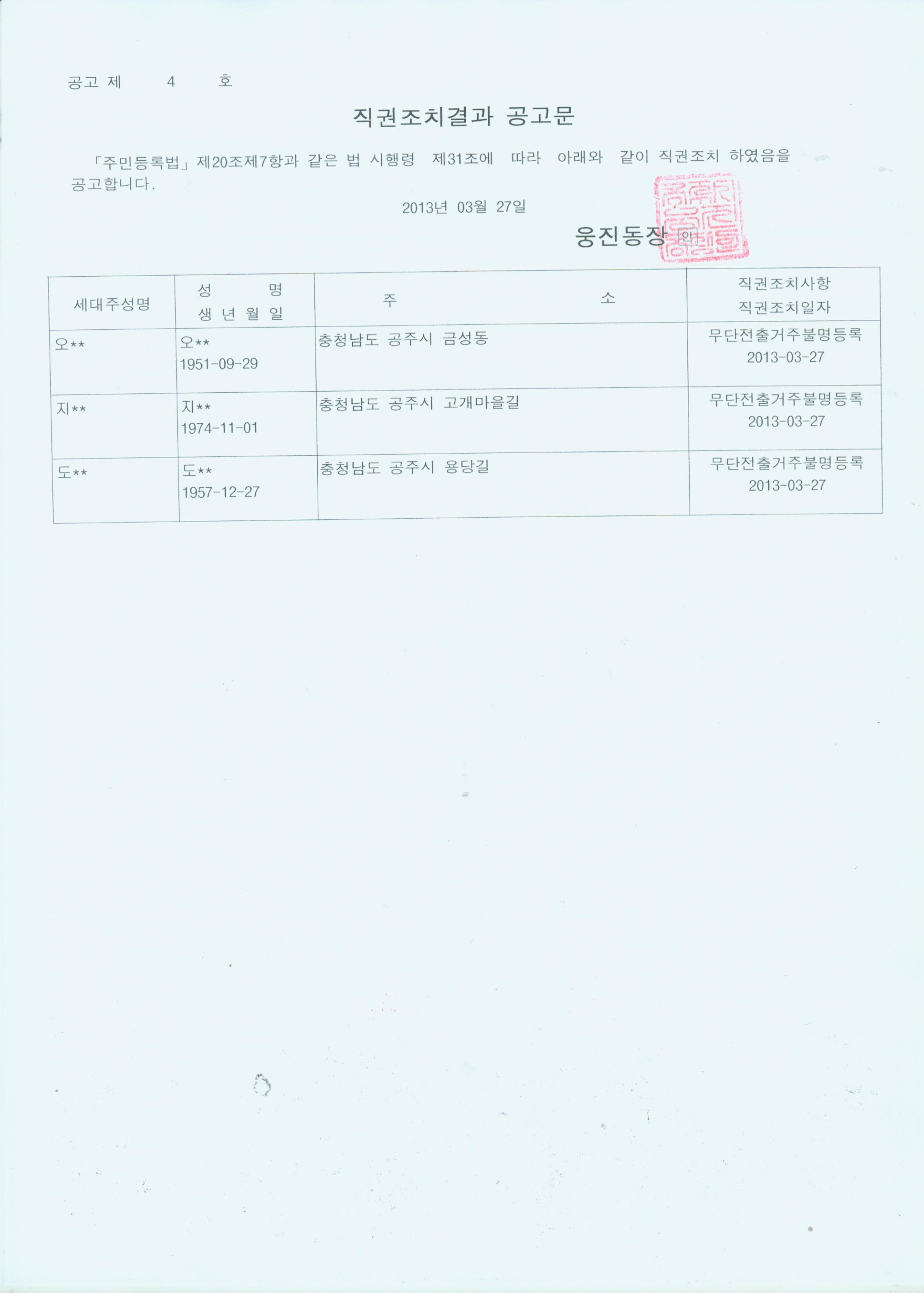 | 30 | 거주불명등록자 행정 주소 이전 조치 결과 공고 | 웅진동 | 4,455 | 2013-04-02 | 직권조치결과 공고문.pdf |