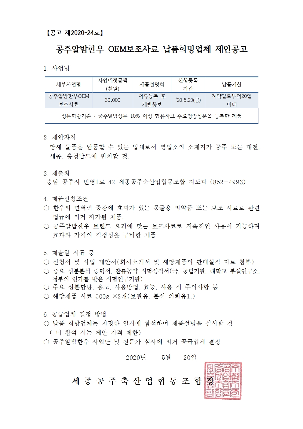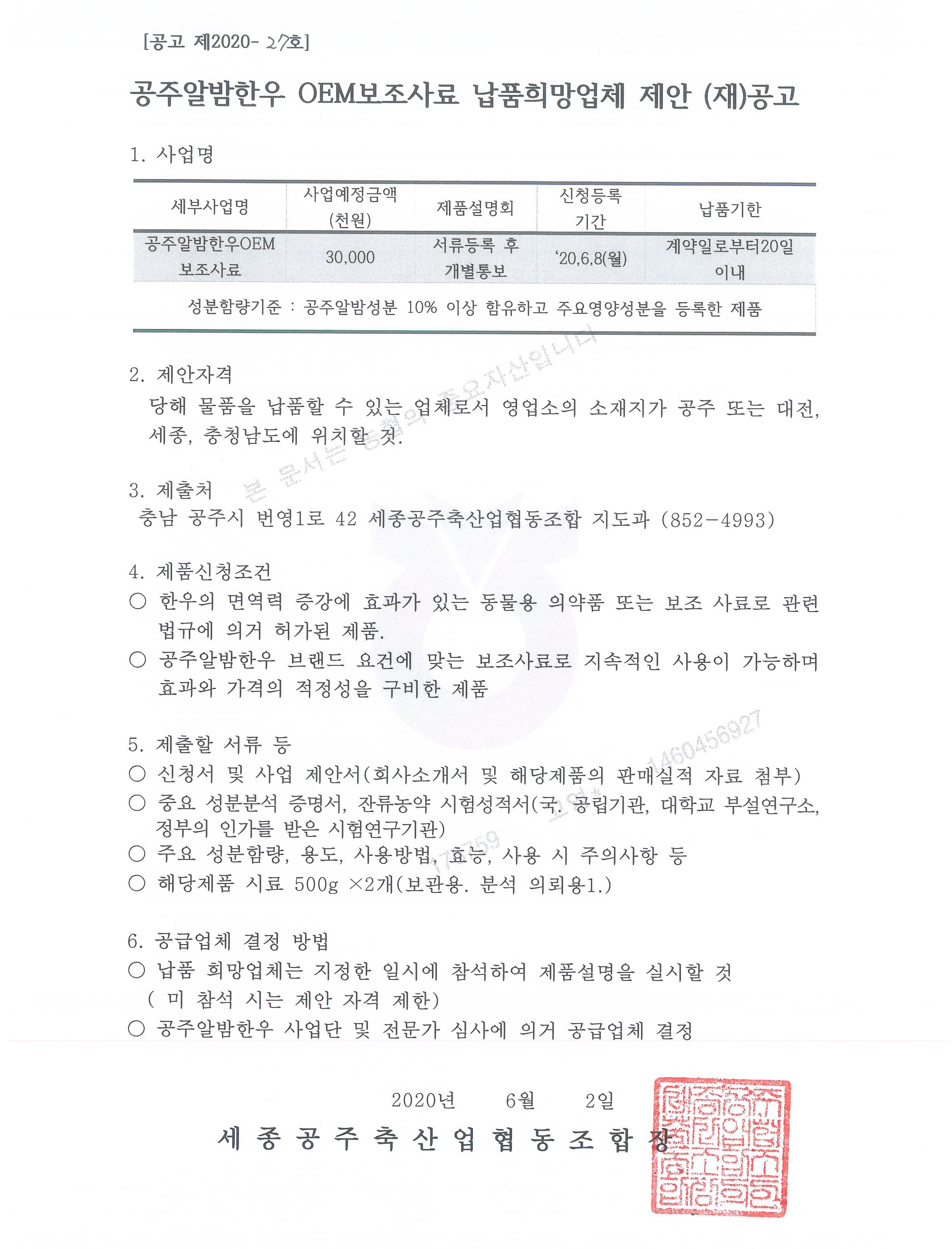 | 652 | 공주알밤한우 보조사료 납품 희망업체 공모 | 축산유통팀 | 95 | 2020-05-26 | 공주알밤한우 보조사료 남품 희망업체 제안 공고(세종공주축협).jpg |