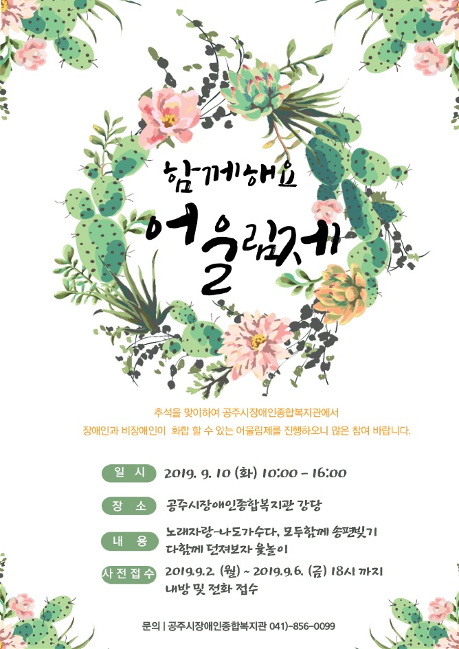 | 564 | 공주시장애인종합복지관 추석맞이 행사 (함께해요 어울림제) 알림 | 경로장애인과 | 884 | 2019-09-02 | 추석명절 홍보포스터.jpg |
