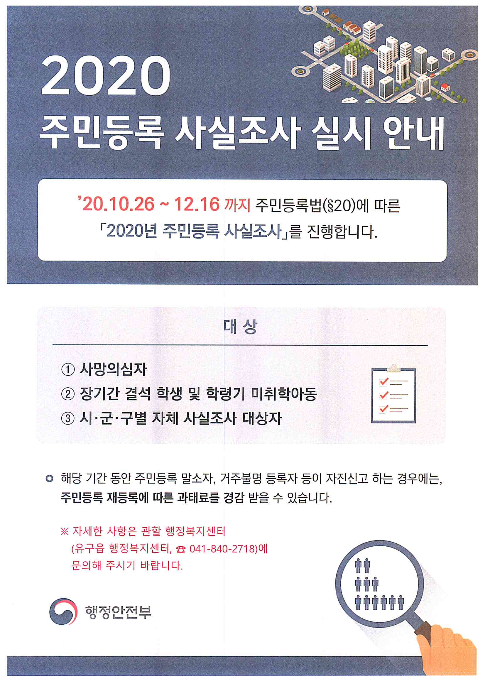 | 395 | 2020년 하반기 주민등록 사실조사 실시 | 유구읍 | 92 | 2020-11-03 | 2020 주민등록 사실조사 실시 안내.jpg |