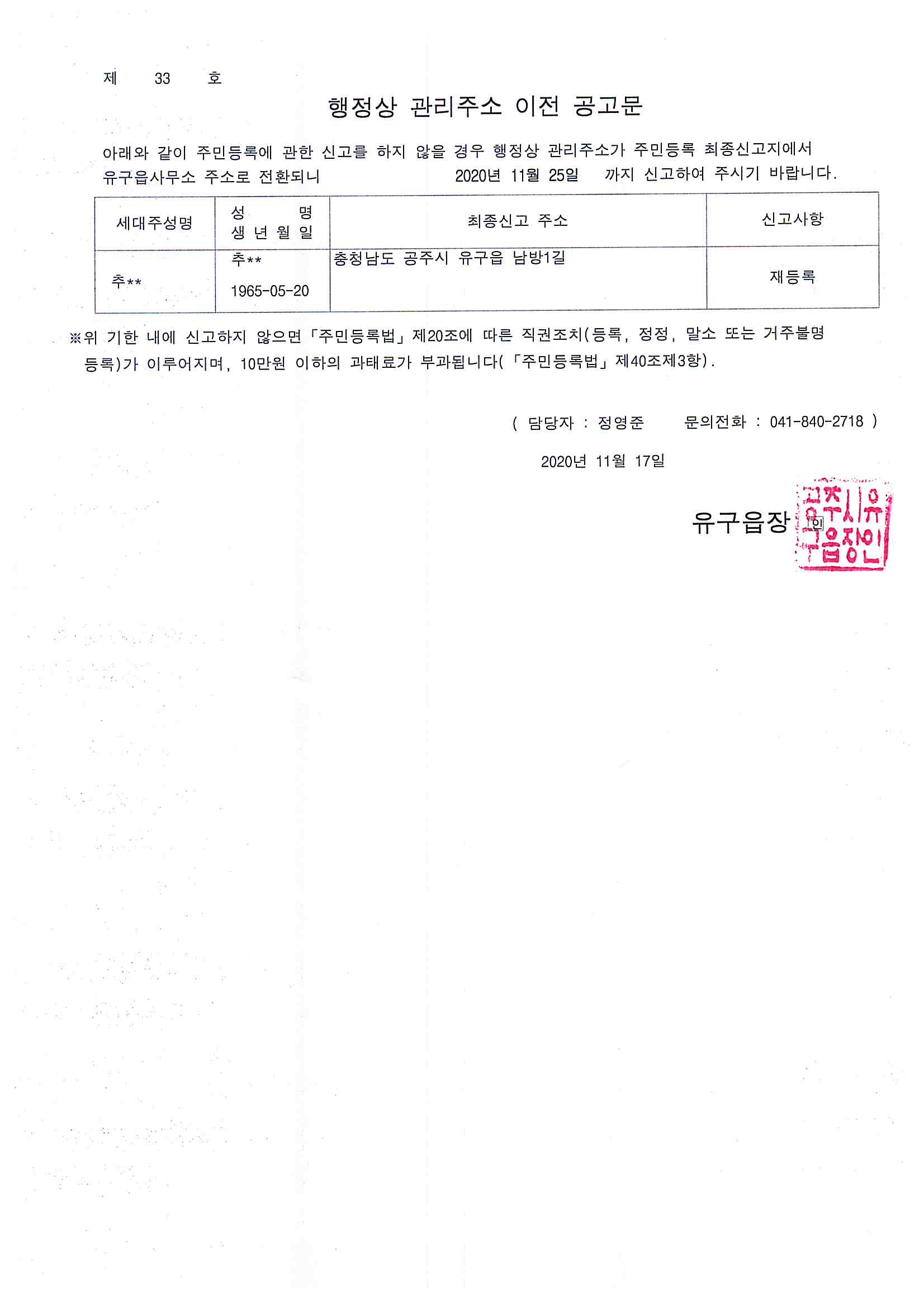 | 400 | 주민등록 거주불명 등록자 행정상 관리주소 이전공고(2차) | 유구읍 | 91 | 2020-11-18 | 행정상 관리주소 이전 공고문(2차).jpg |