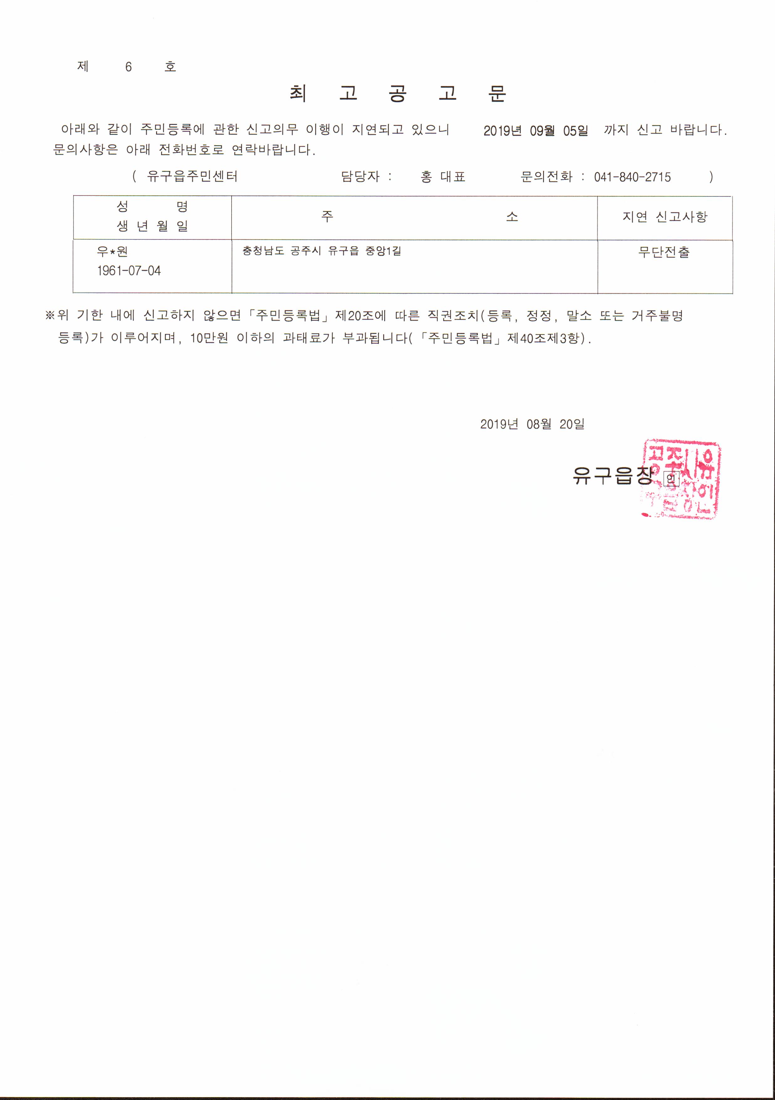| 313 | 주민등록 무단전출자에 대한 최고 공고 | 유구읍 | 145 | 2019-08-20 | 중앙1길 거주불명 최고공고문.jpg |
