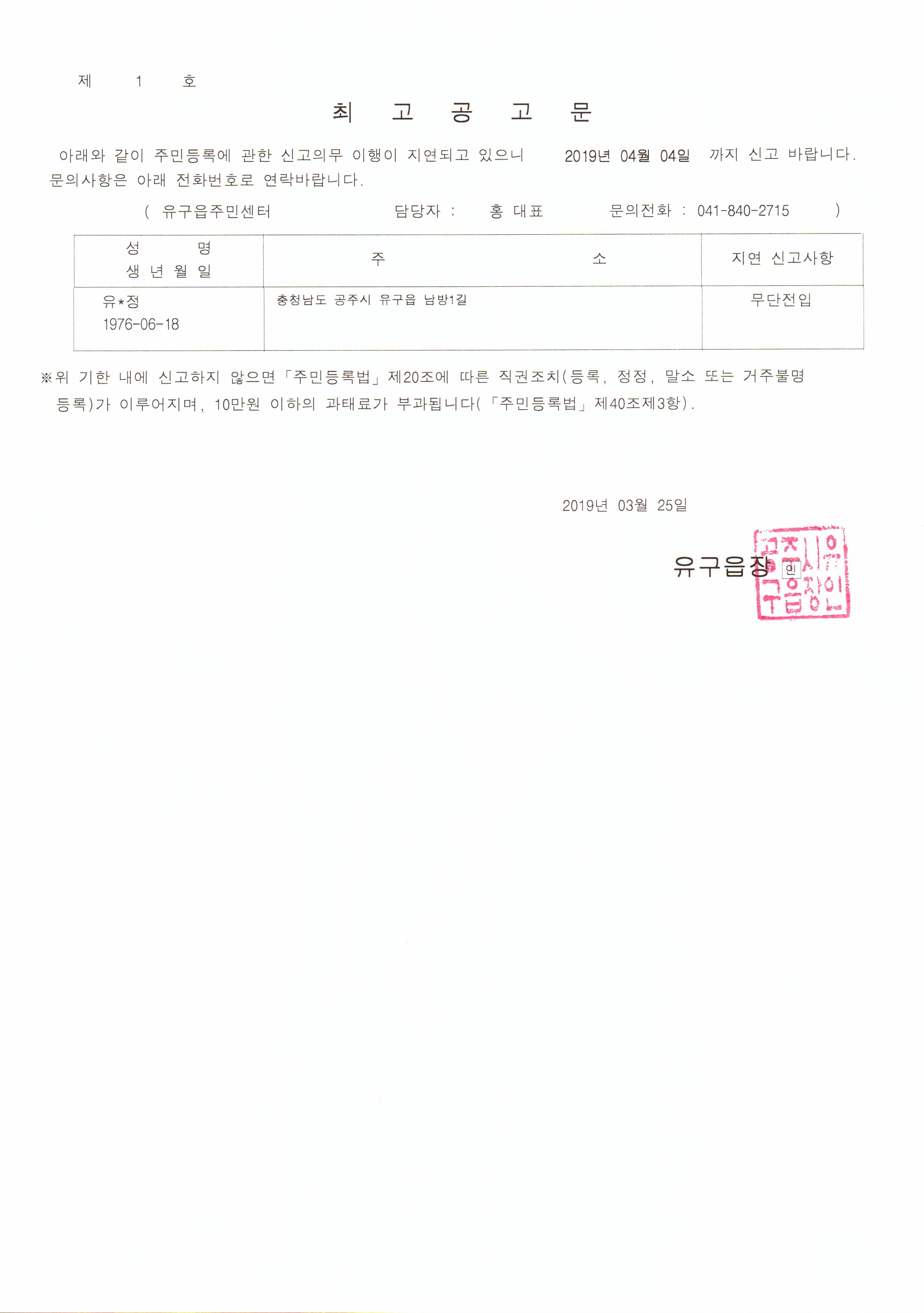 | 307 | 주민등록 무단전출자에 대한 최고공고 | 유구읍 | 146 | 2019-06-04 | 최고공고문.jpg |
