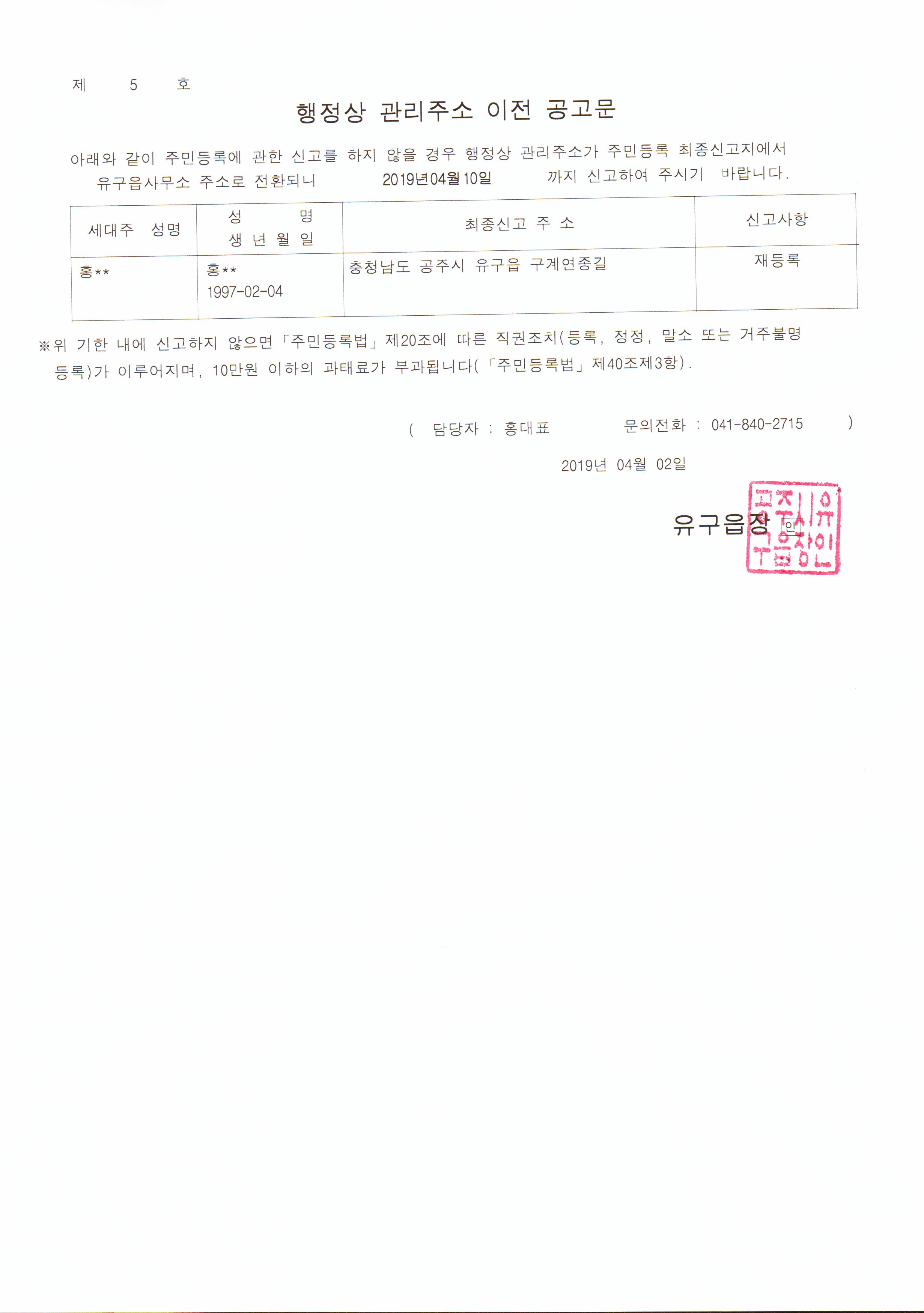 | 305 | 주민등록 거주불명등록자 행정상 관리주소 이전 공고(1차) | 유구읍 | 203 | 2019-04-02 | 행정상 관리주소 이전 공고문.jpg |