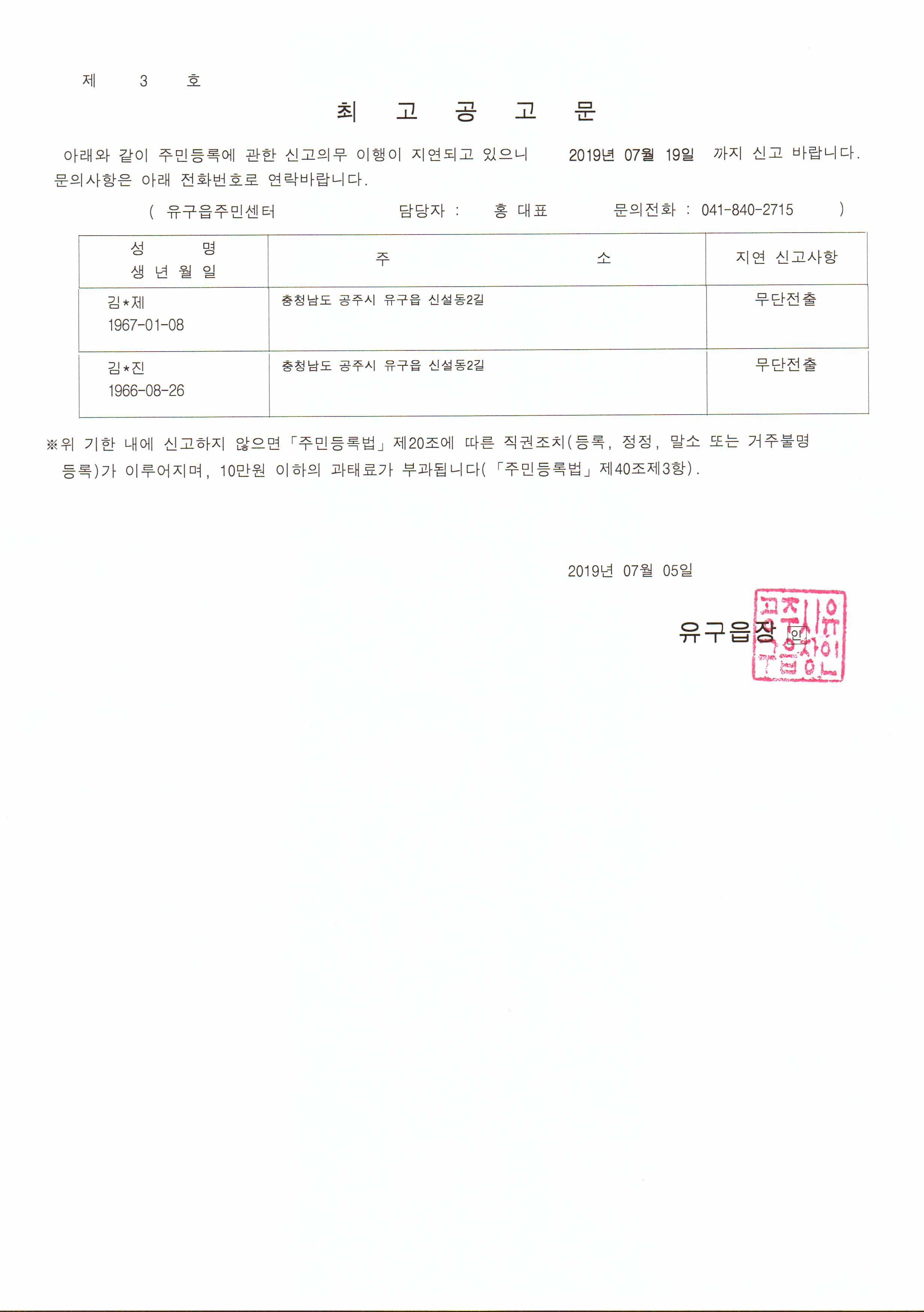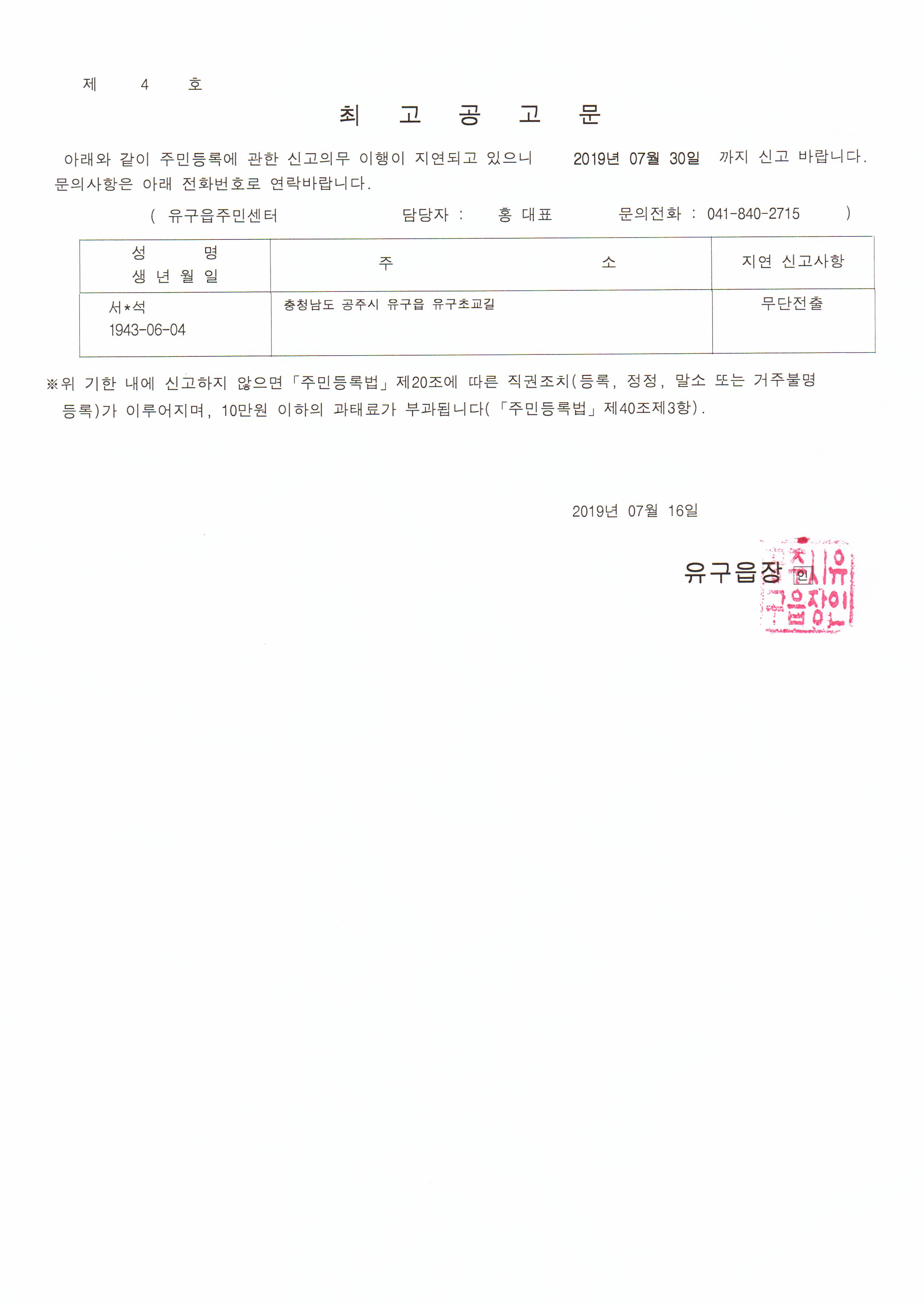 | 310 | 주민등록 무단전출자에 대한 최고공고 | 유구읍 | 184 | 2019-07-16 | 최고공고문001.jpg |