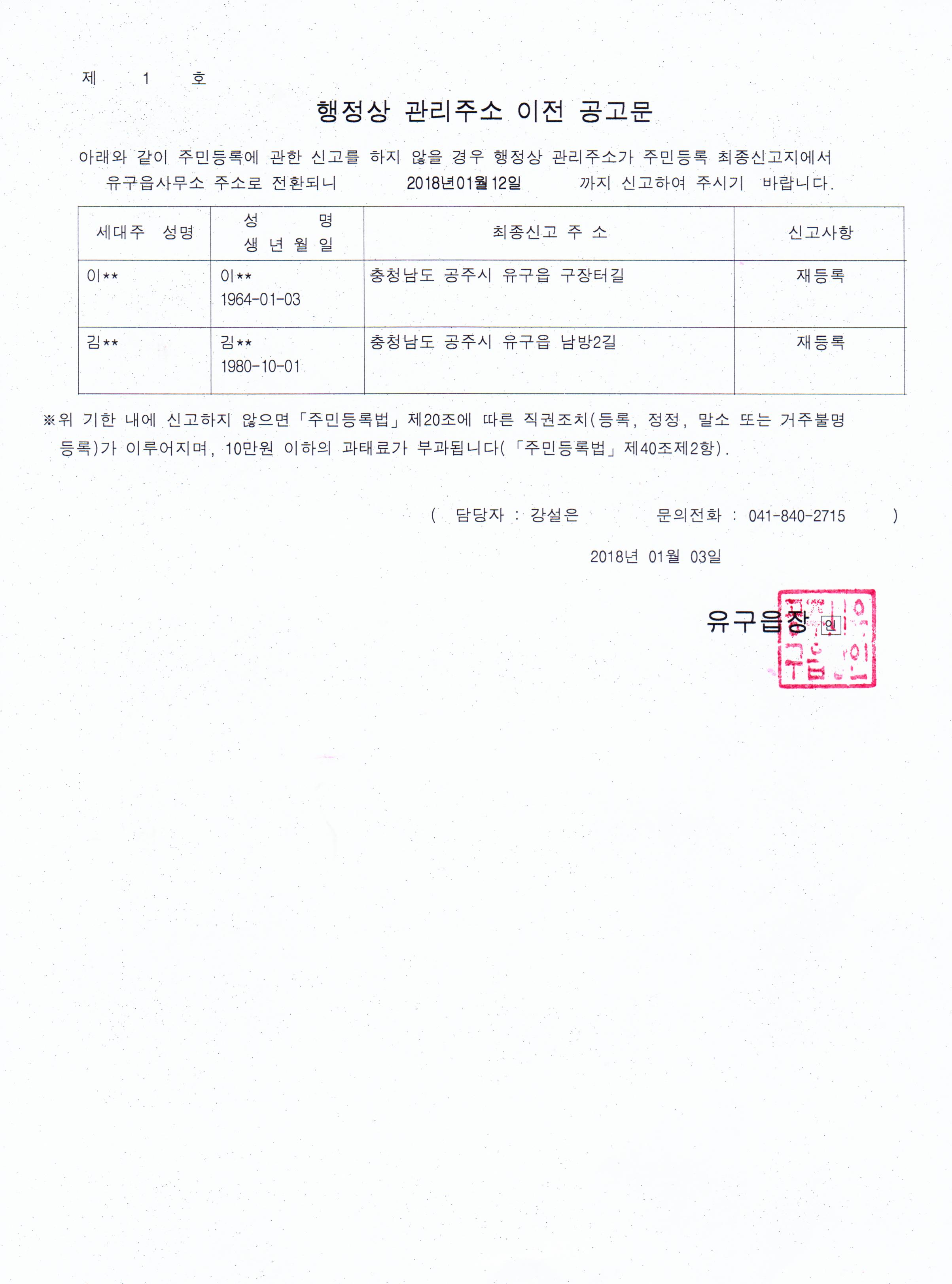 | 272 | 거주불명자 행정상 관리주소 이전 공고 | 유구읍 | 335 | 2018-01-03 | 행정상관리주소이전공고문.jpg |