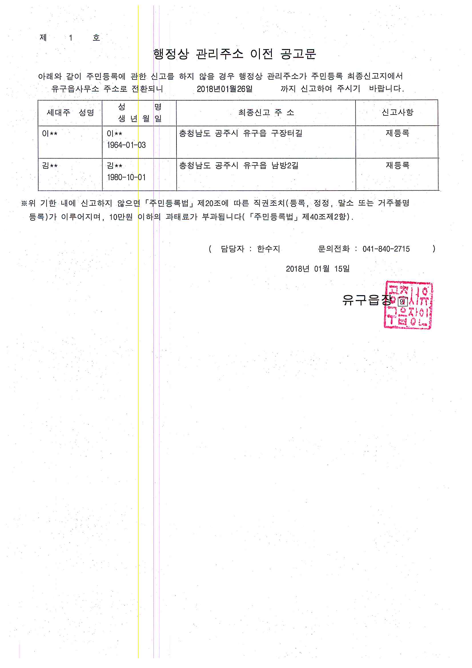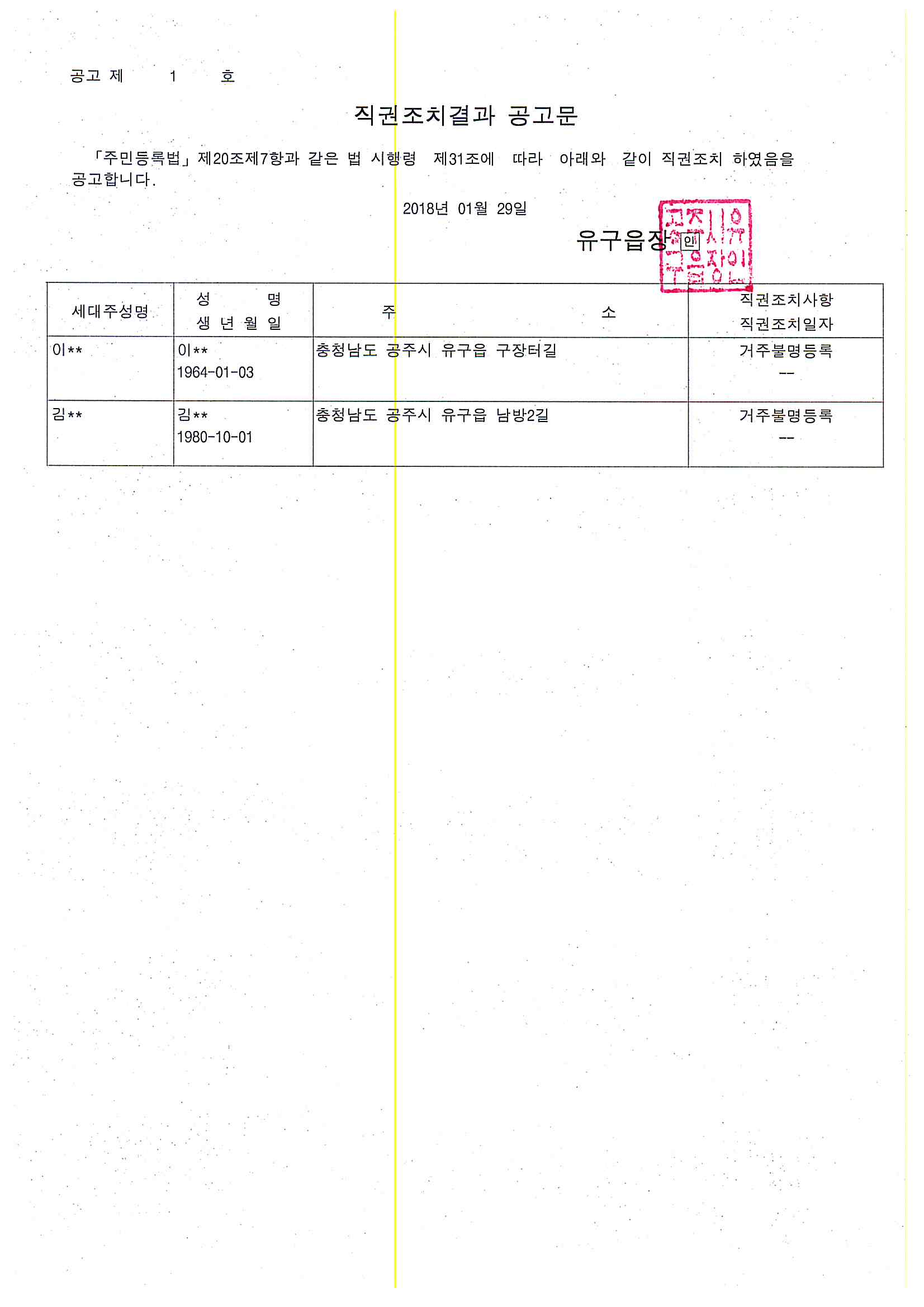 | 275 | 주민등록 거주불명등록자 행정상 관리주소 이전 직권조치 결과공고 | 유구읍 | 278 | 2018-01-29 | 직권조치결과 공고문.jpg |
