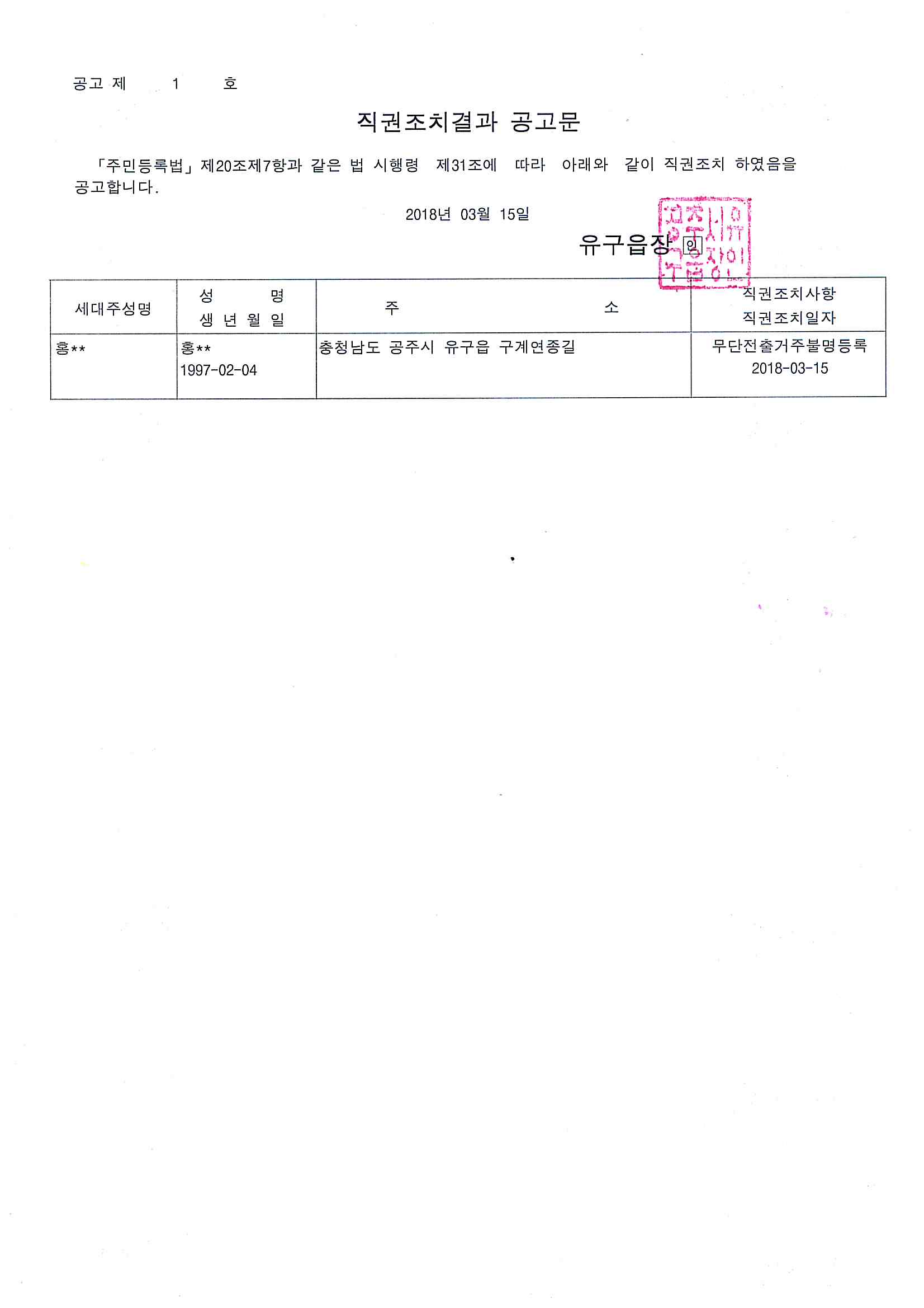 | 278 | 주민등록 직권조치결과 공고 | 유구읍 | 201 | 2018-03-15 | 직권조치결과 공고문.jpg |