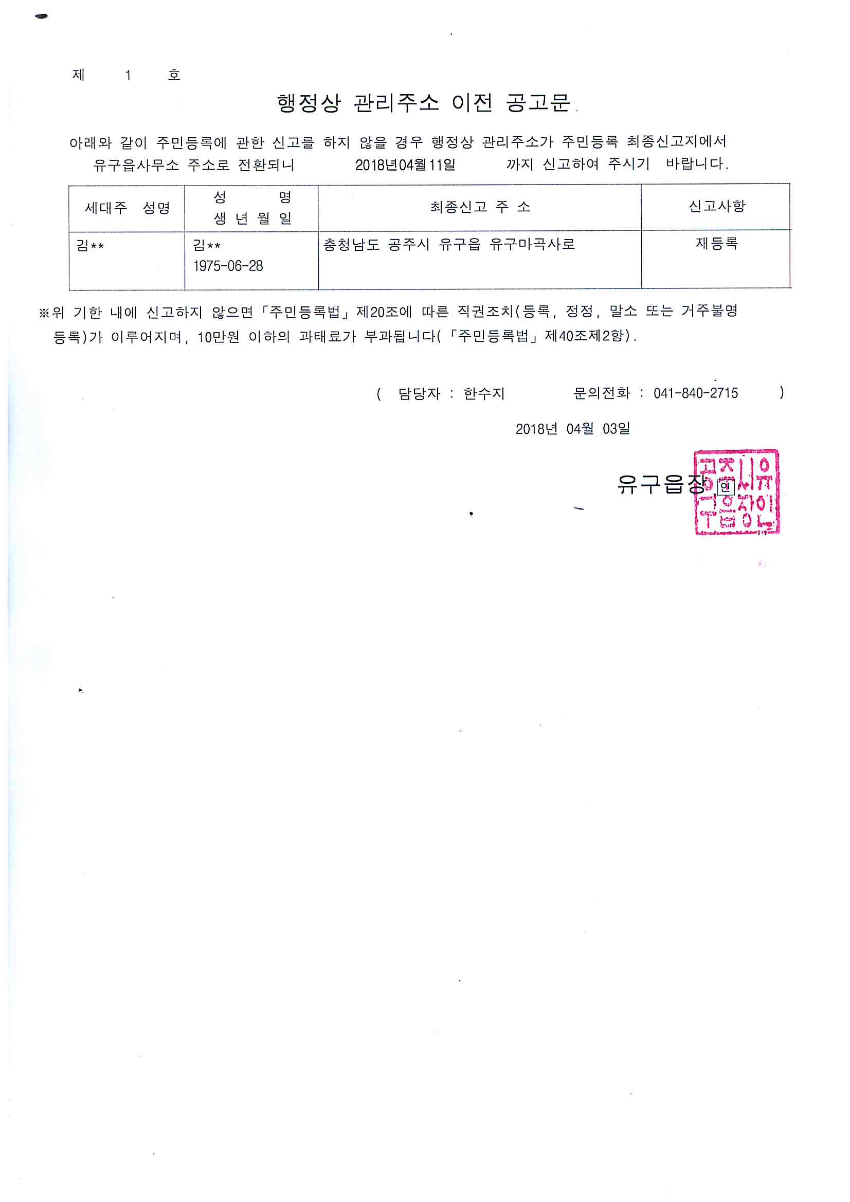 | 280 | 주민등록 거주불명등록자 행정상 관리주소 이전 공고(1차) | 유구읍 | 227 | 2018-04-03 | 거주불명등록자 행정상관리주소 이전공고(1차).jpg |