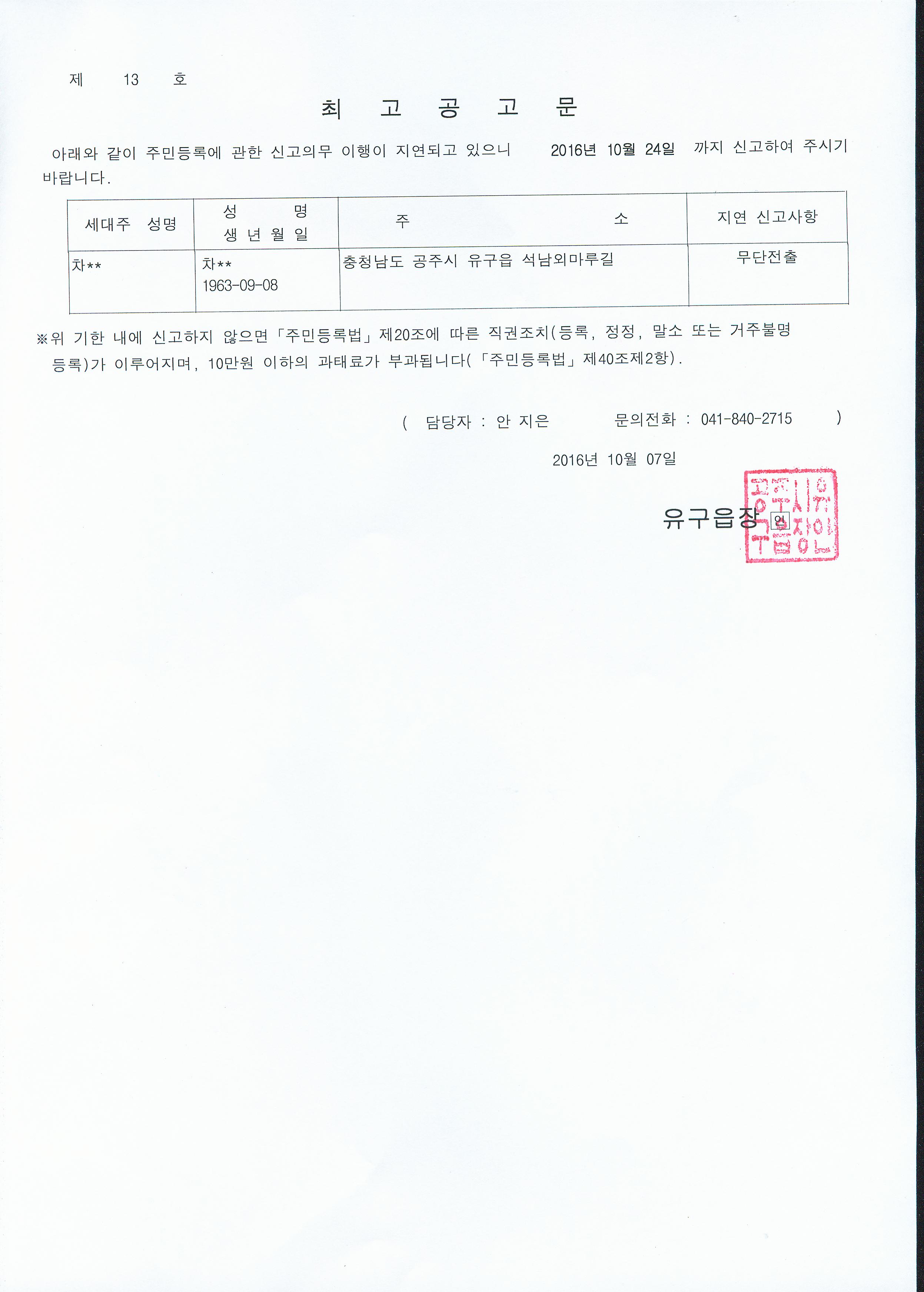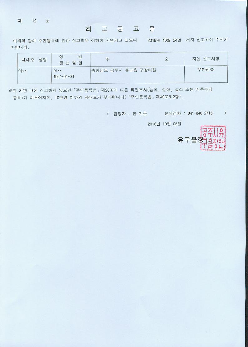 | 239 | 주민등록 최고 공고 | 유구읍 | 696 | 2016-10-07 | 최고공고문.jpg |