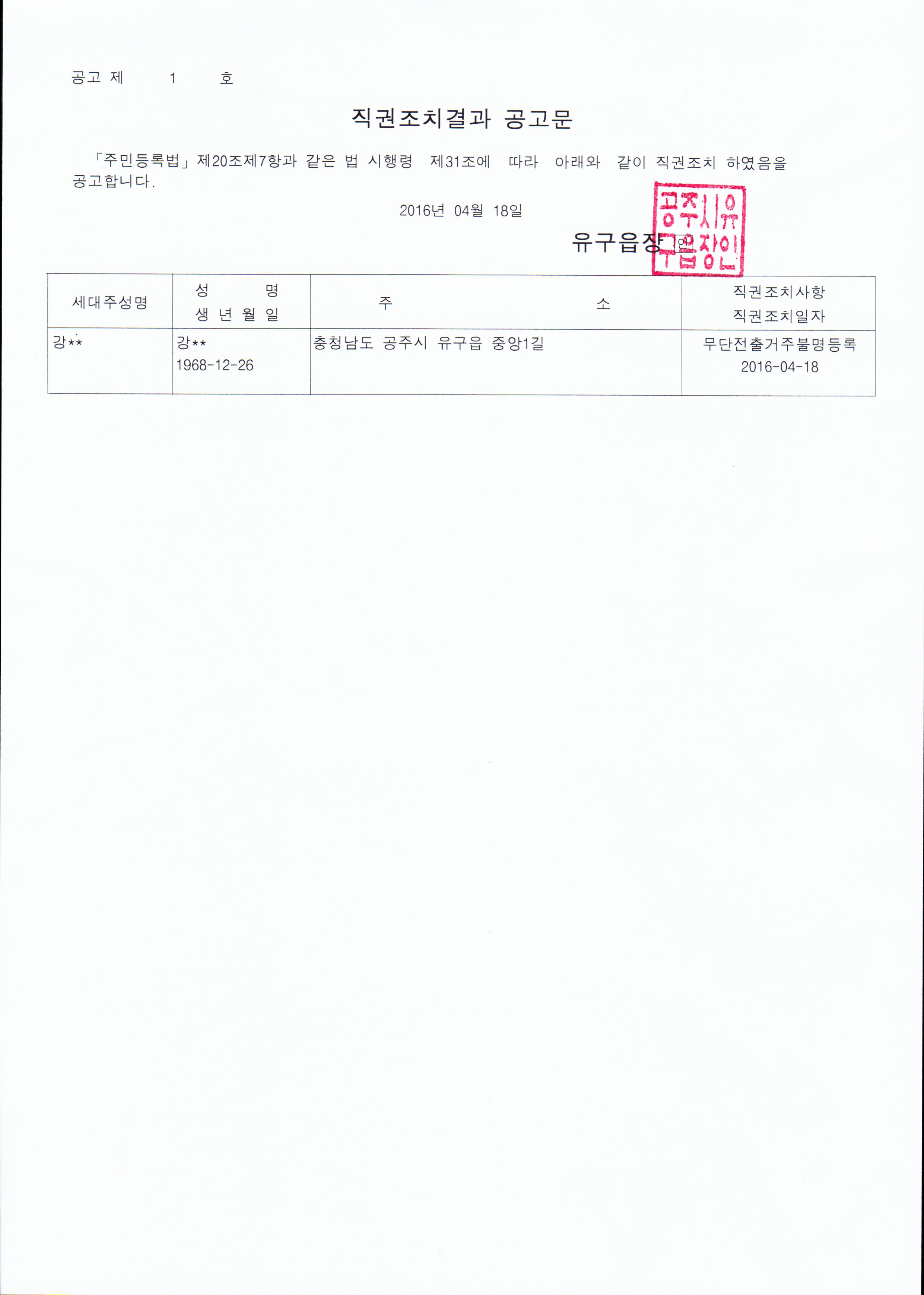 | 224 | 직권조치 결과 통지 및 공고 | 유구읍 | 1,081 | 2016-04-20 | 직권조치 결과 공고문.jpg |