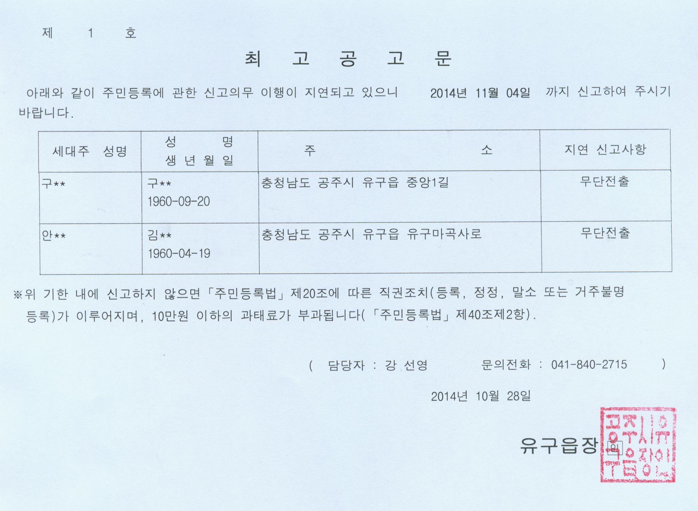 | 181 | 주민등록 최고공고 | 유구읍 | 1,327 | 2014-10-28 | 최고공고문.jpg |