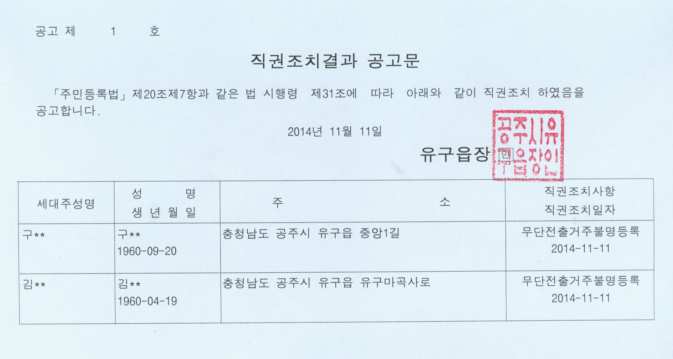 | 183 | 직권조치결과 통지 및 공고 | 유구읍 | 1,369 | 2014-11-11 | 직권조치결과 공고문.jpg |