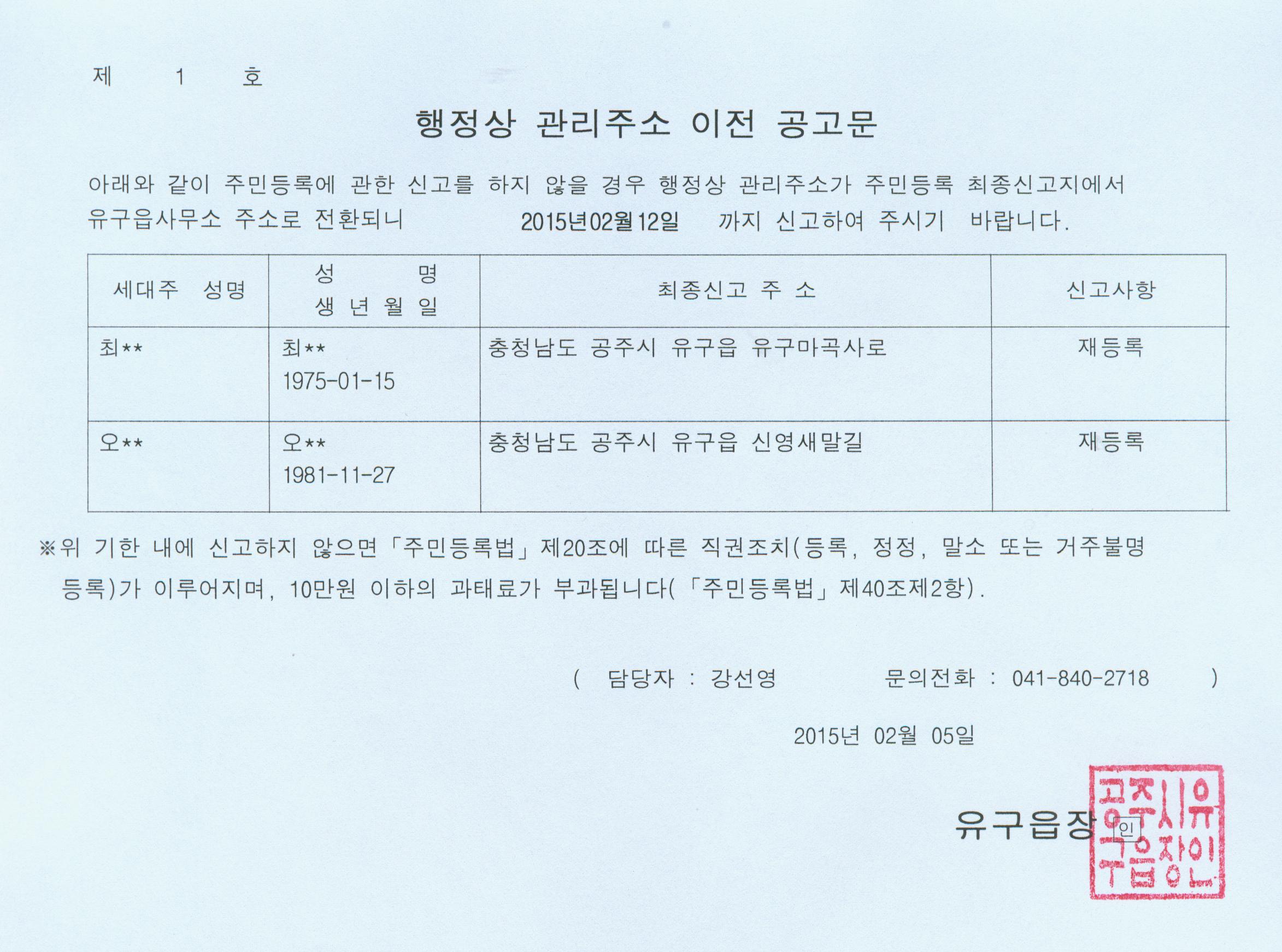 | 190 | 거주불명등록자 행정상관리주소 이전공고(1차) | 유구읍 | 1,326 | 2015-02-05 | 행정상관리주소 이전 공고문.jpg |