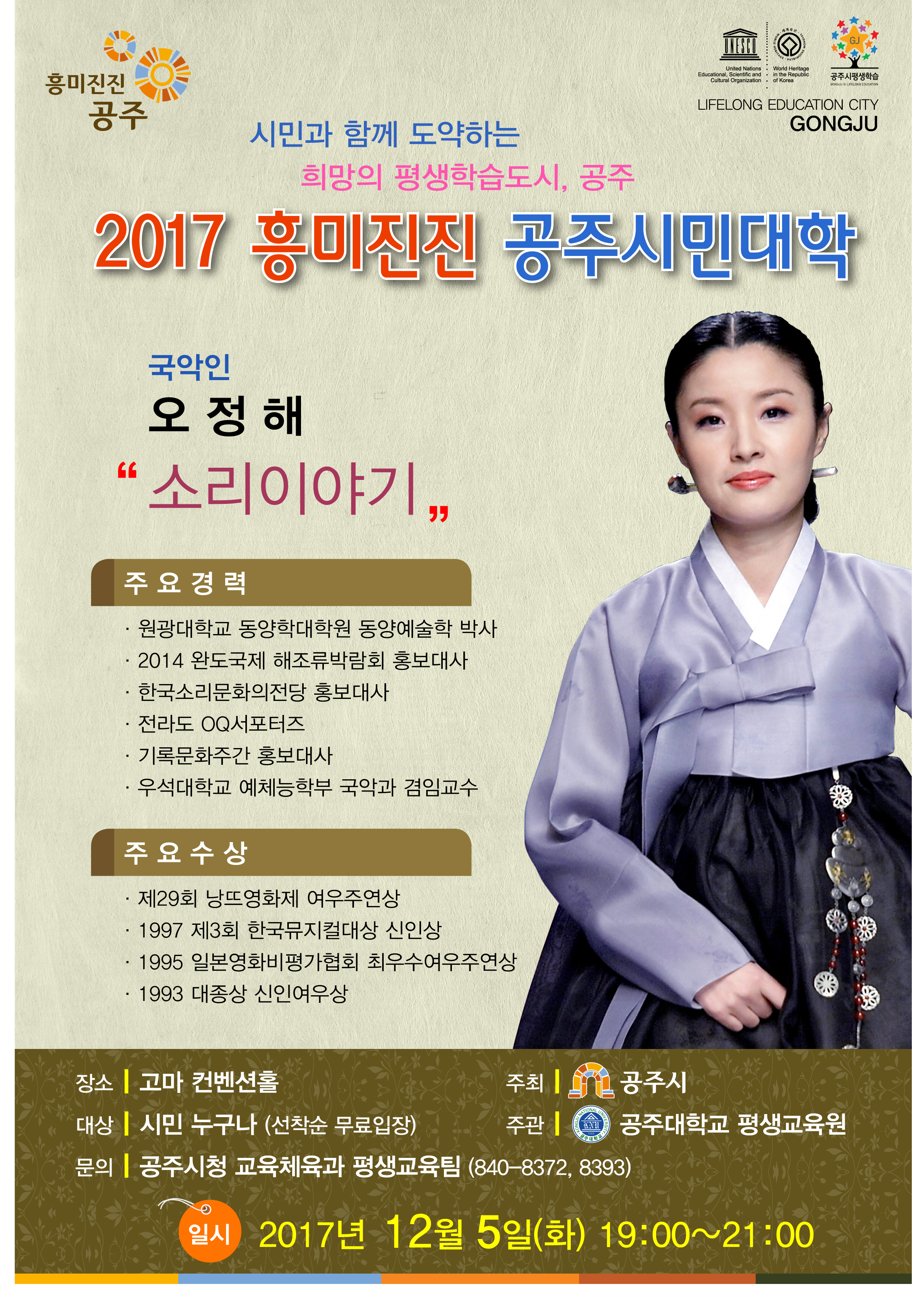 | 397 | 2017 흥미진진, 공주시민대학 제39강 안내("소리이야기" 국악인 오정해 교수) | 탄천면 | 187 | 2017-11-23 | 홍보문.jpg |