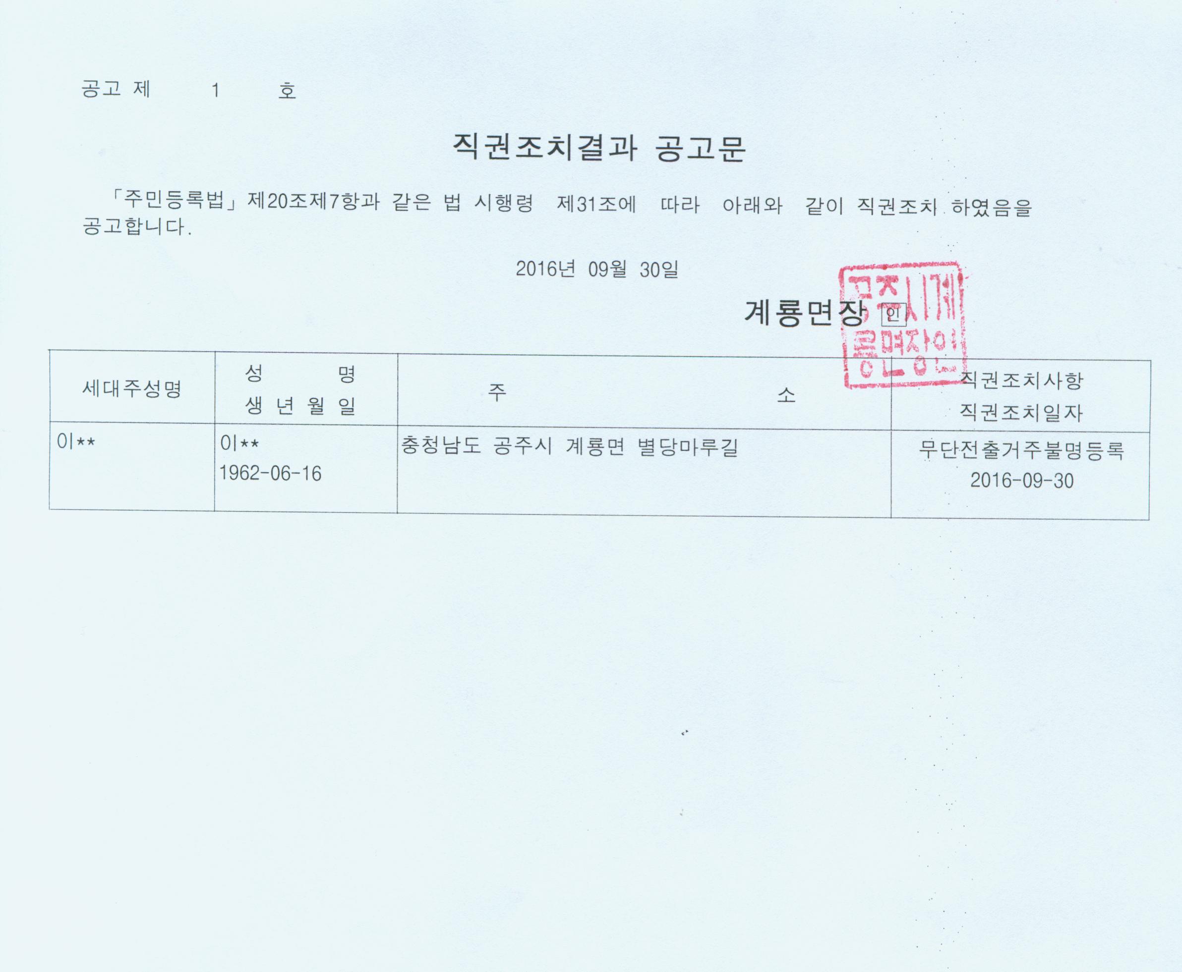 | 263 | 거주불명등록 직권조치 공고 | 계룡면 | 394 | 2016-09-30 | 직권조치결과 공고문.jpg |