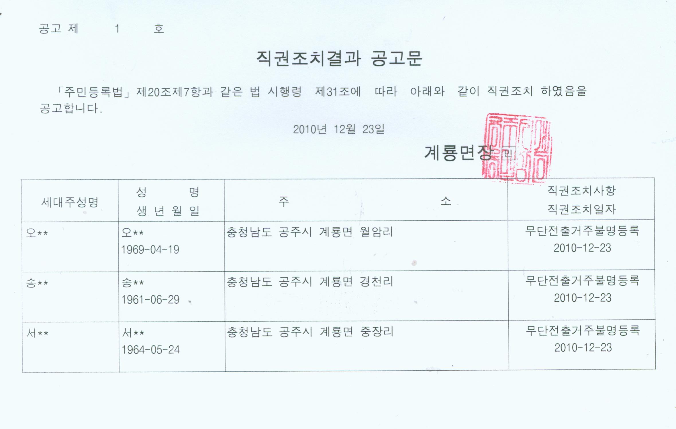 | 161 | 주민등록 직권조치사항공고 | 관리자 | 1,232 | 2010-12-23 | 직권조치결과 공고문.jpg |