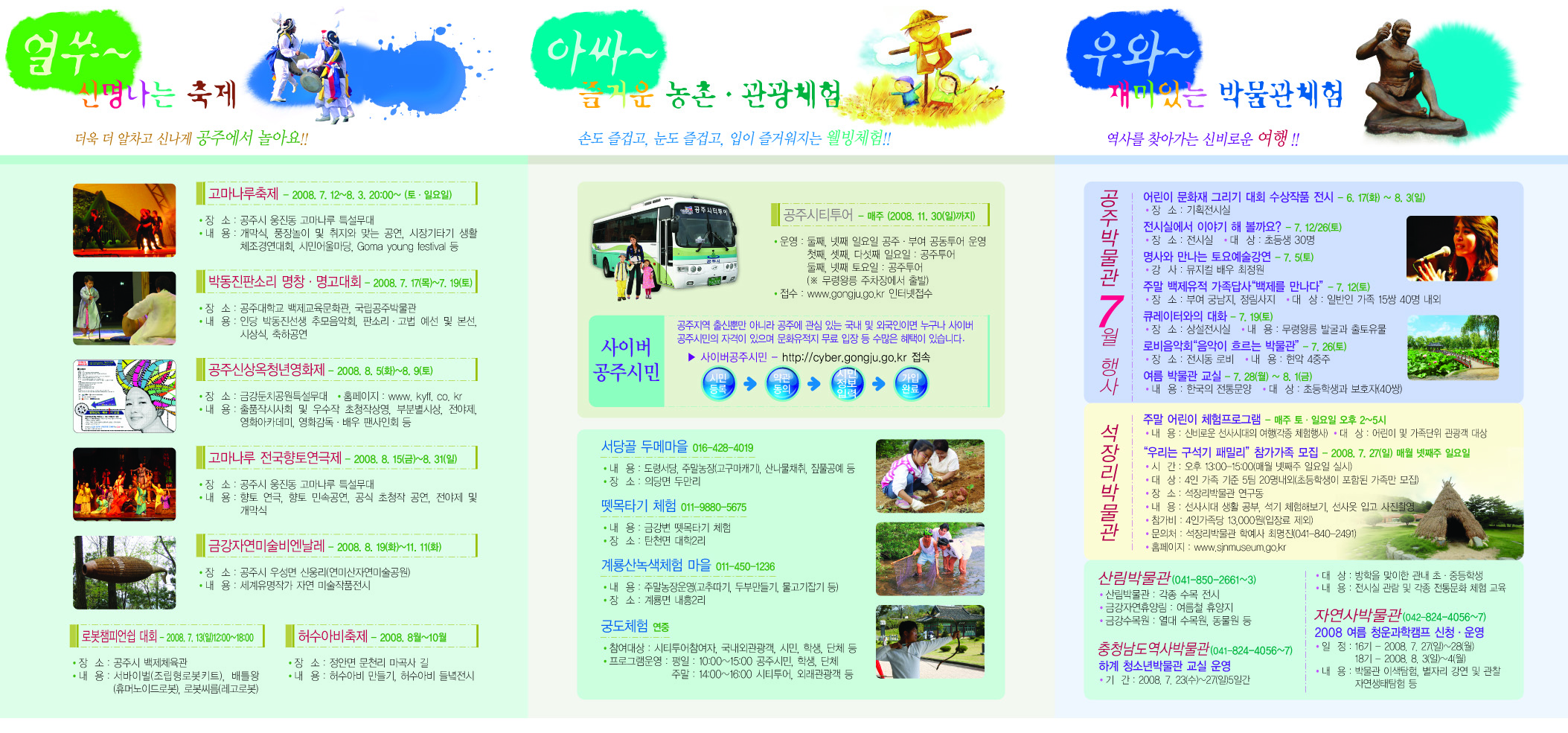 | 25 | 주말축제와 함께 !, 영화제 그리고 미술비엔날레가 공주에서 | 관리자 | 657 | 2008-07-08 | 고마나루축제등 다양한 행사.jpg |
