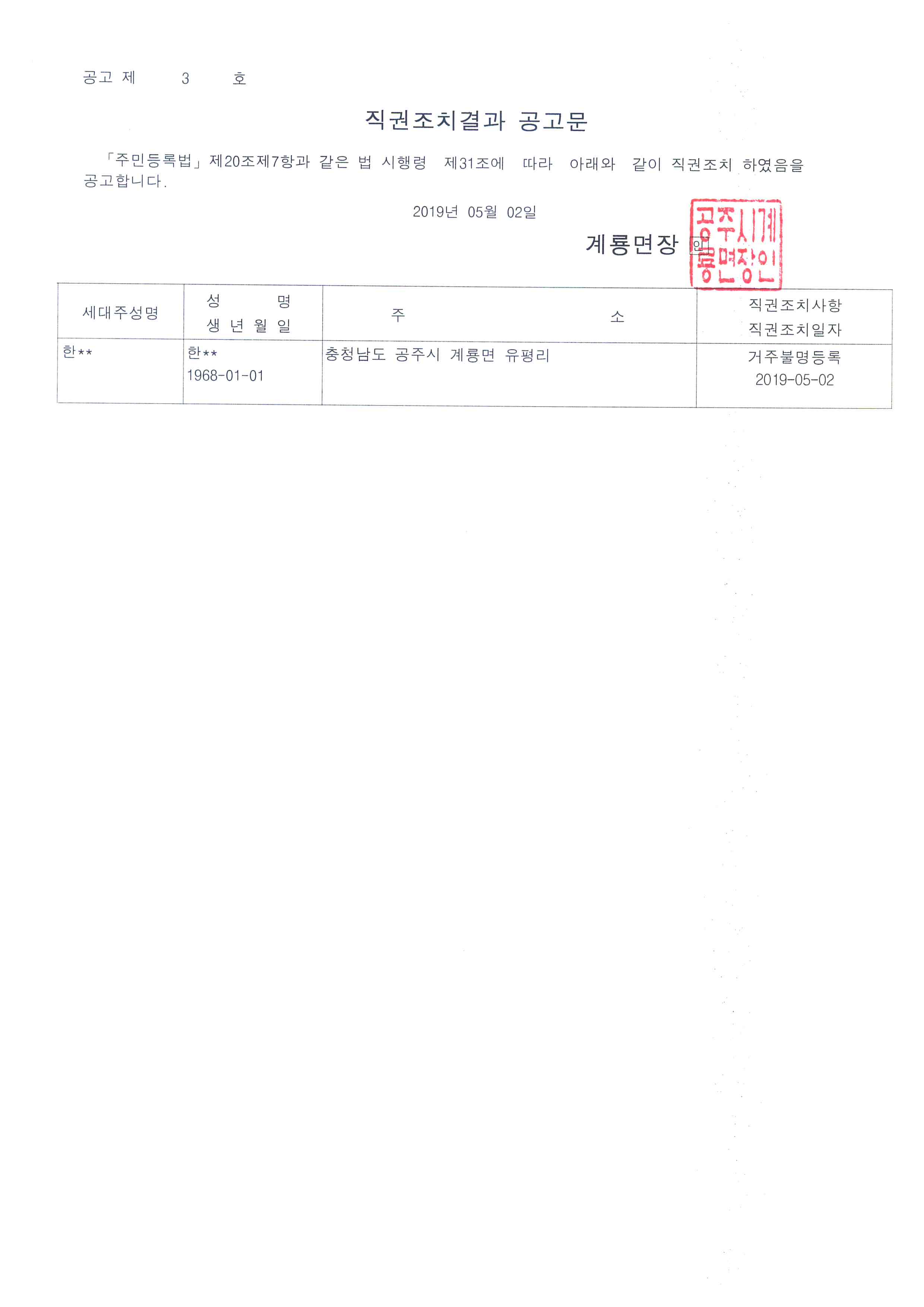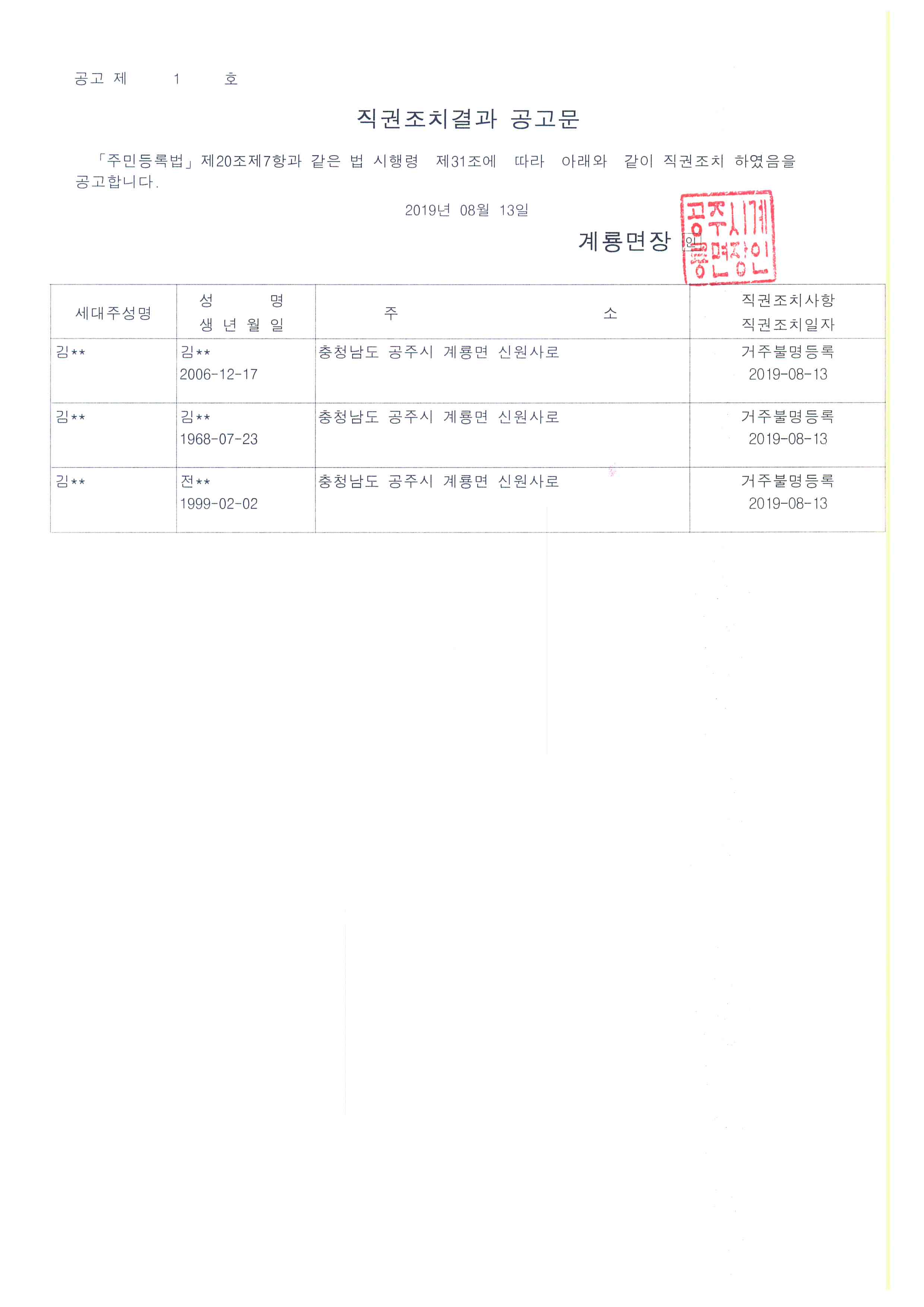 | 371 | 거주불명등록자 행정상 관리주소 이전 직권조치 결과 공고 | 계룡면 | 106 | 2019-08-13 | 행정상 관리주소 이전 직권조치결과 공고문.jpg |