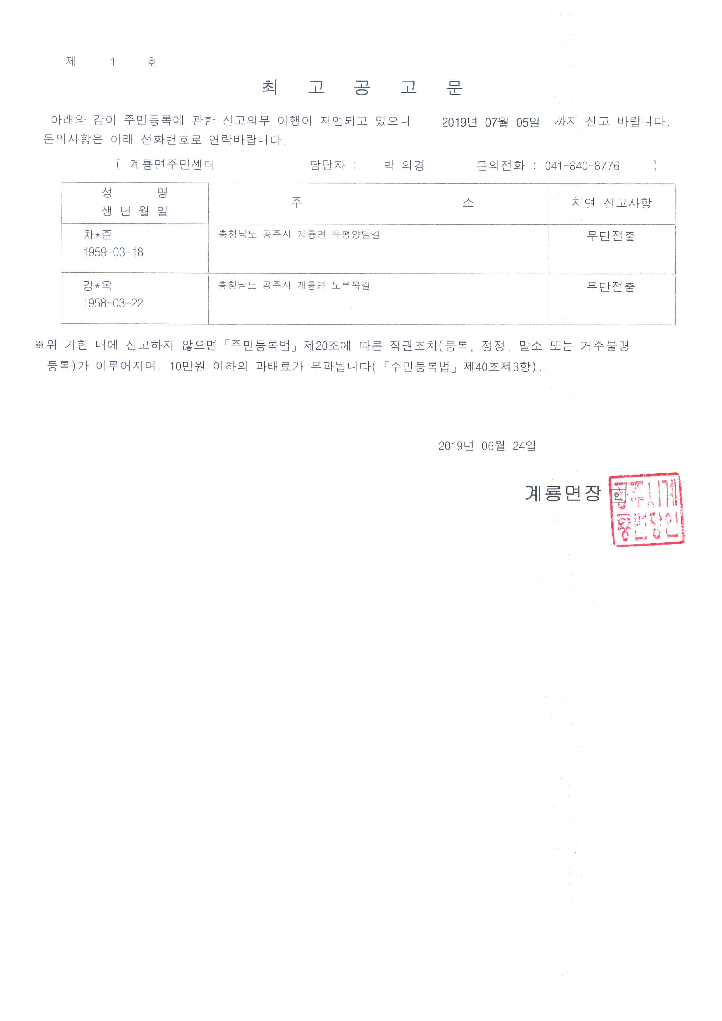 | 366 | 주민등록 무단전출자에 대한 최고공고 | 계룡면 | 90 | 2019-06-24 | 최고공고문.jpg |