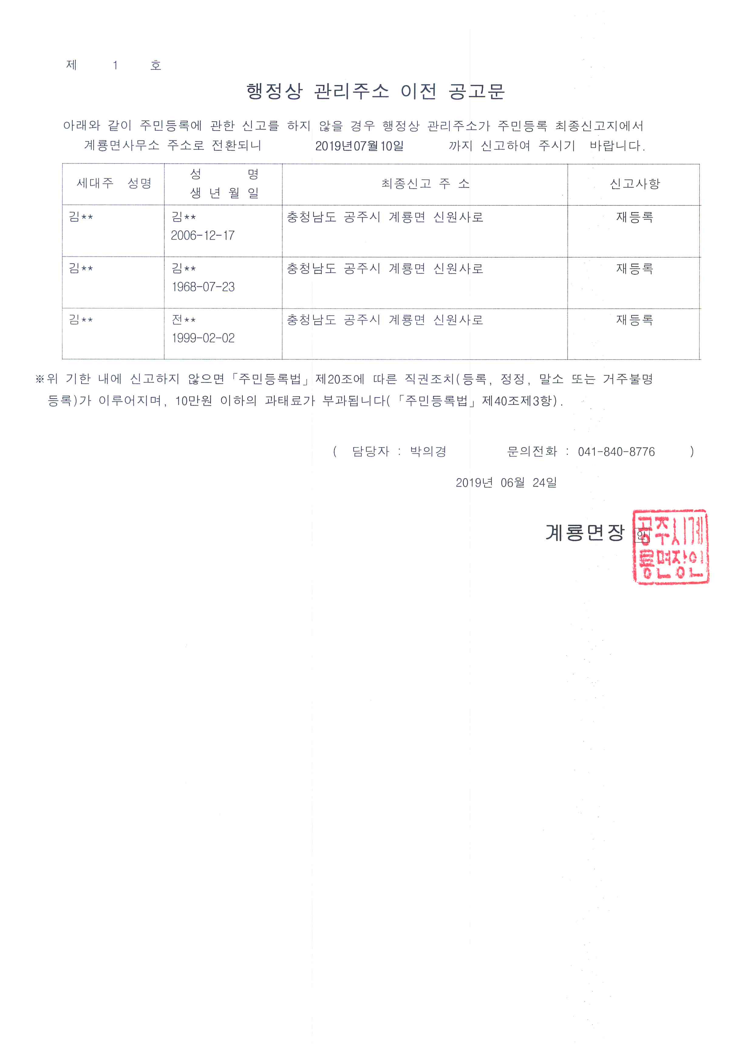 | 367 | 주민등록 거주불명등록자 행정상 관리주소 이전 1차 공고 | 계룡면 | 106 | 2019-06-24 | 행정상 관리주소 이전 공고문(1차).jpg |