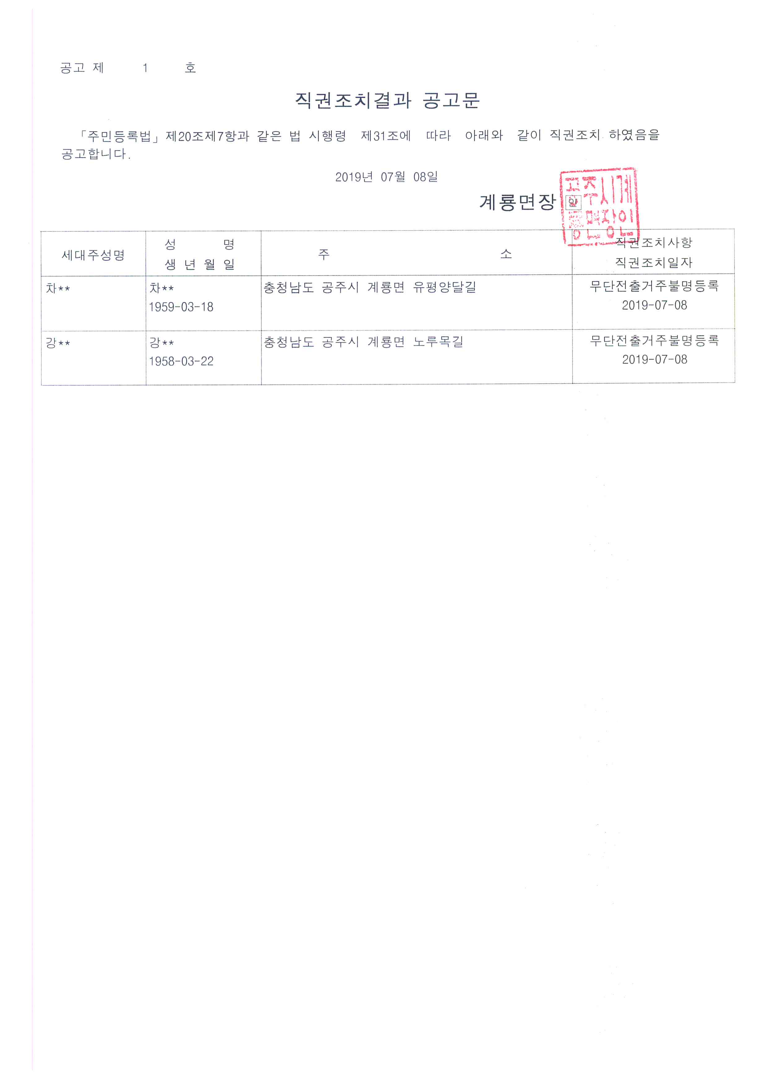 | 368 | 주민등록 무단전출자(거주불명등록) 직권조치 공고 | 계룡면 | 99 | 2019-07-08 | 직권조치결과 공고문.jpg |