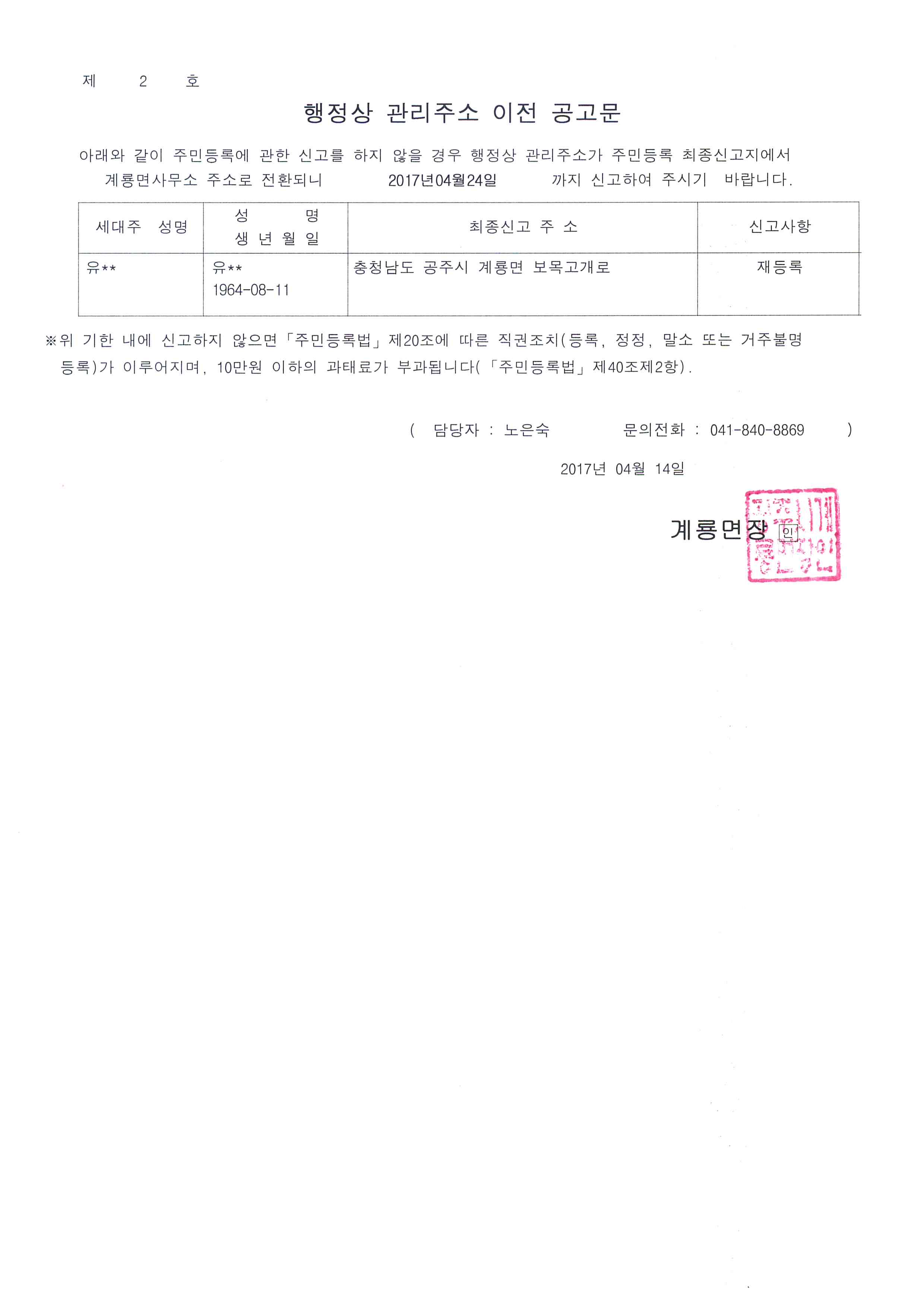 | 303 | 주민등록 거주불명자 행정상 관리주소 이전 2차 공고 | 계룡면 | 680 | 2017-04-14 | 행정상관리주소이전공고문2차.jpg |