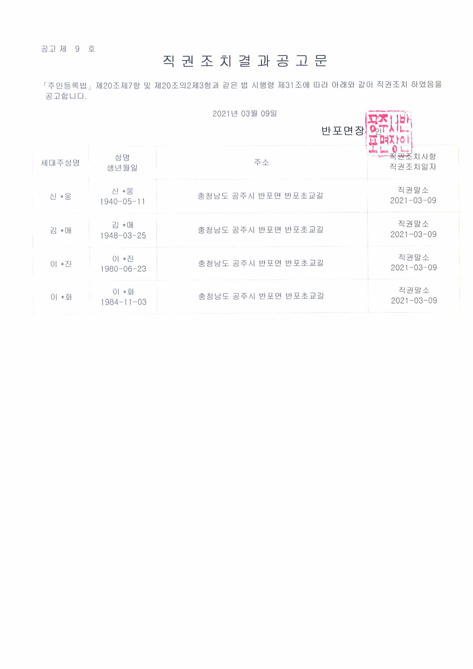 | 287 | 주민등록 장기거주불명등록자 직권조치 결과 공고 | 반포면 | 50 | 2021-03-11 | 직권조치결과공고문.jpg |