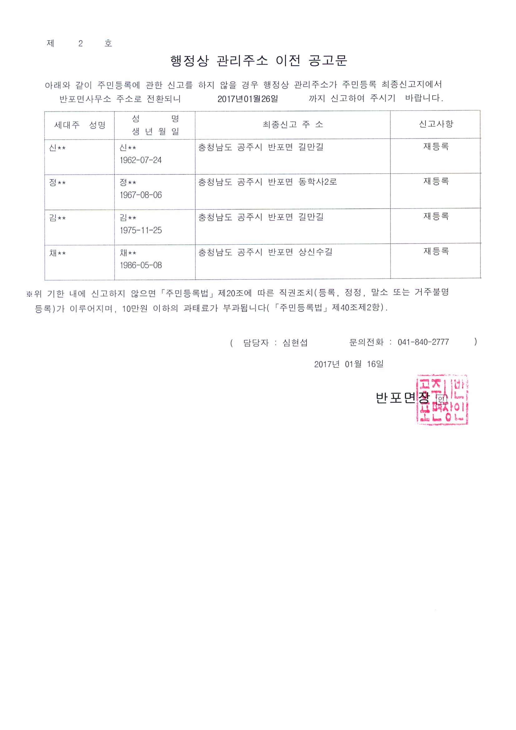 | 162 | 거주불명등록자 행정상 관리주소 이전 공고(2차) | 반포면 | 620 | 2017-01-16 | 행정상 관리주소 이전 공고문.jpg |
