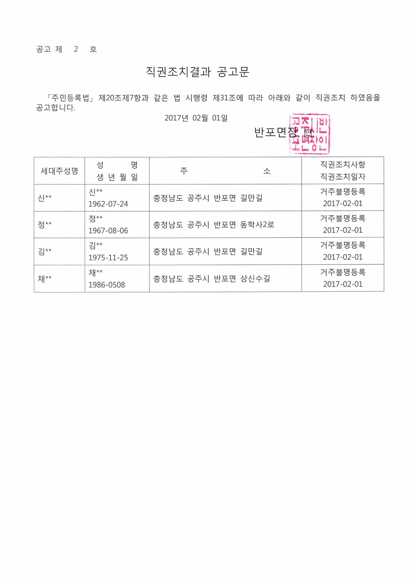 | 163 | 거주불명등록자 행정상 관리주소 이전 직권조치 결과 공고 | 반포면 | 613 | 2017-02-01 | 직권조치결과공고문.jpg |