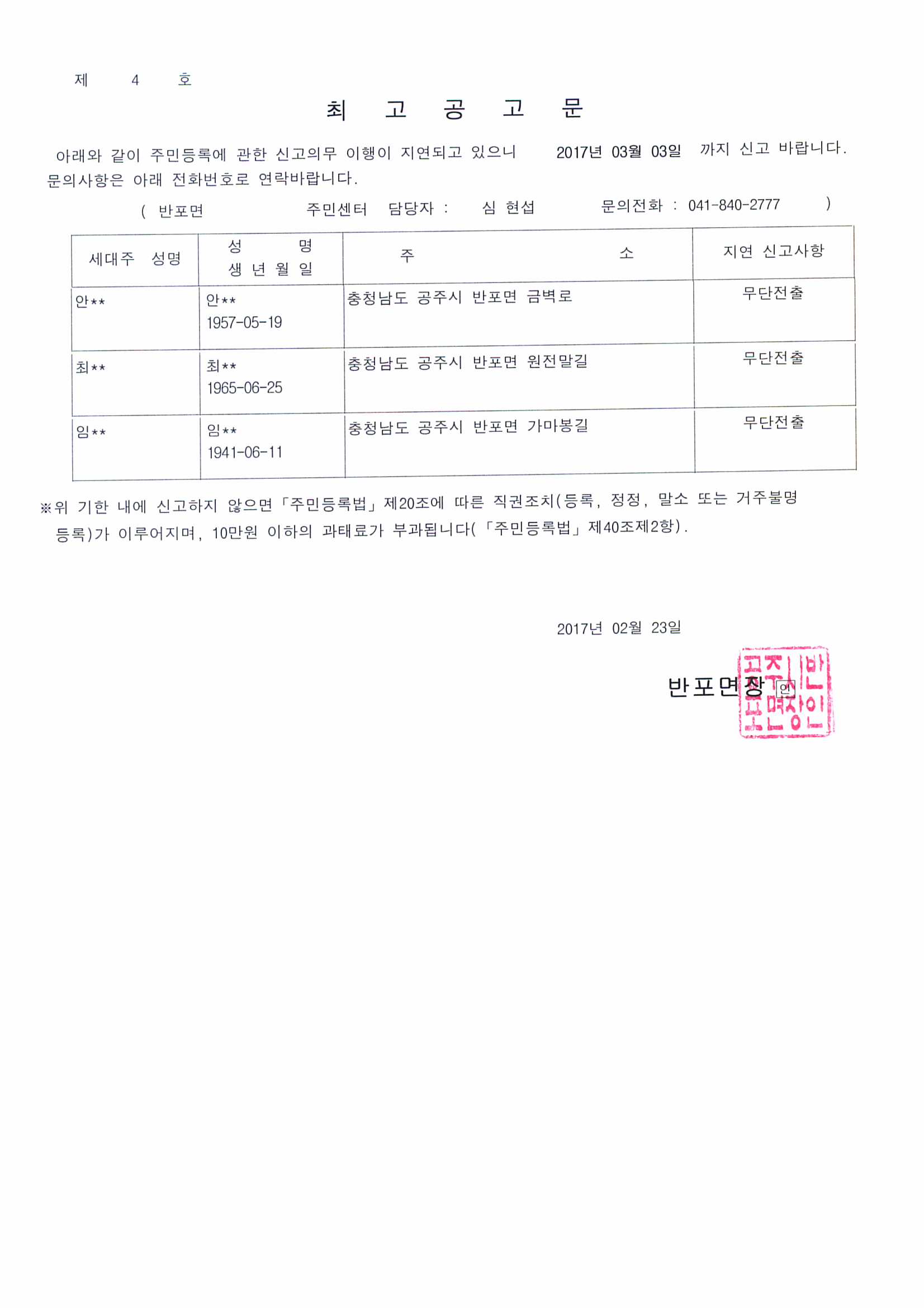 | 164 | 2017년 주민등록일제정리 최고장 반송에 따른 최고공고 | 반포면 | 581 | 2017-02-23 | 최고공고문.jpg |