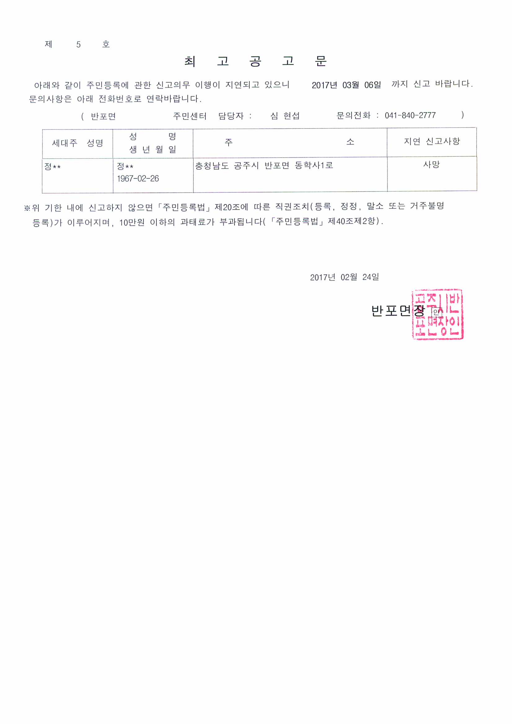 | 165 | 사망자 주민등록 최고공고 | 반포면 | 727 | 2017-02-24 | 최고공고문.jpg |
