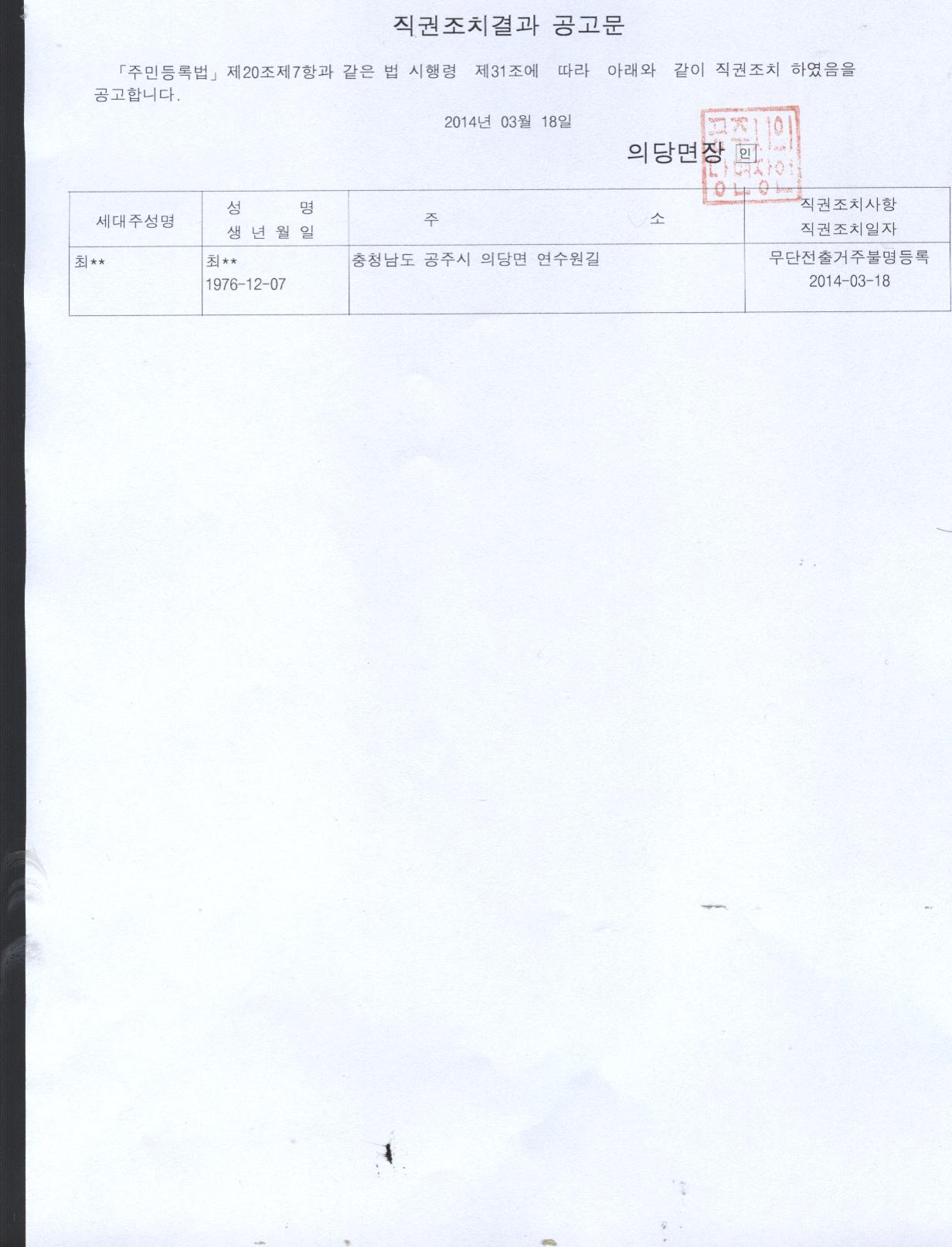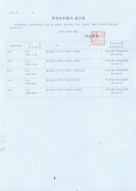 | 136 | 주민등록 무단전출자 직권조치결과 공고 | 의당면 | 1,534 | 2014-04-22 | 직권조치결과 공고문.jpg |