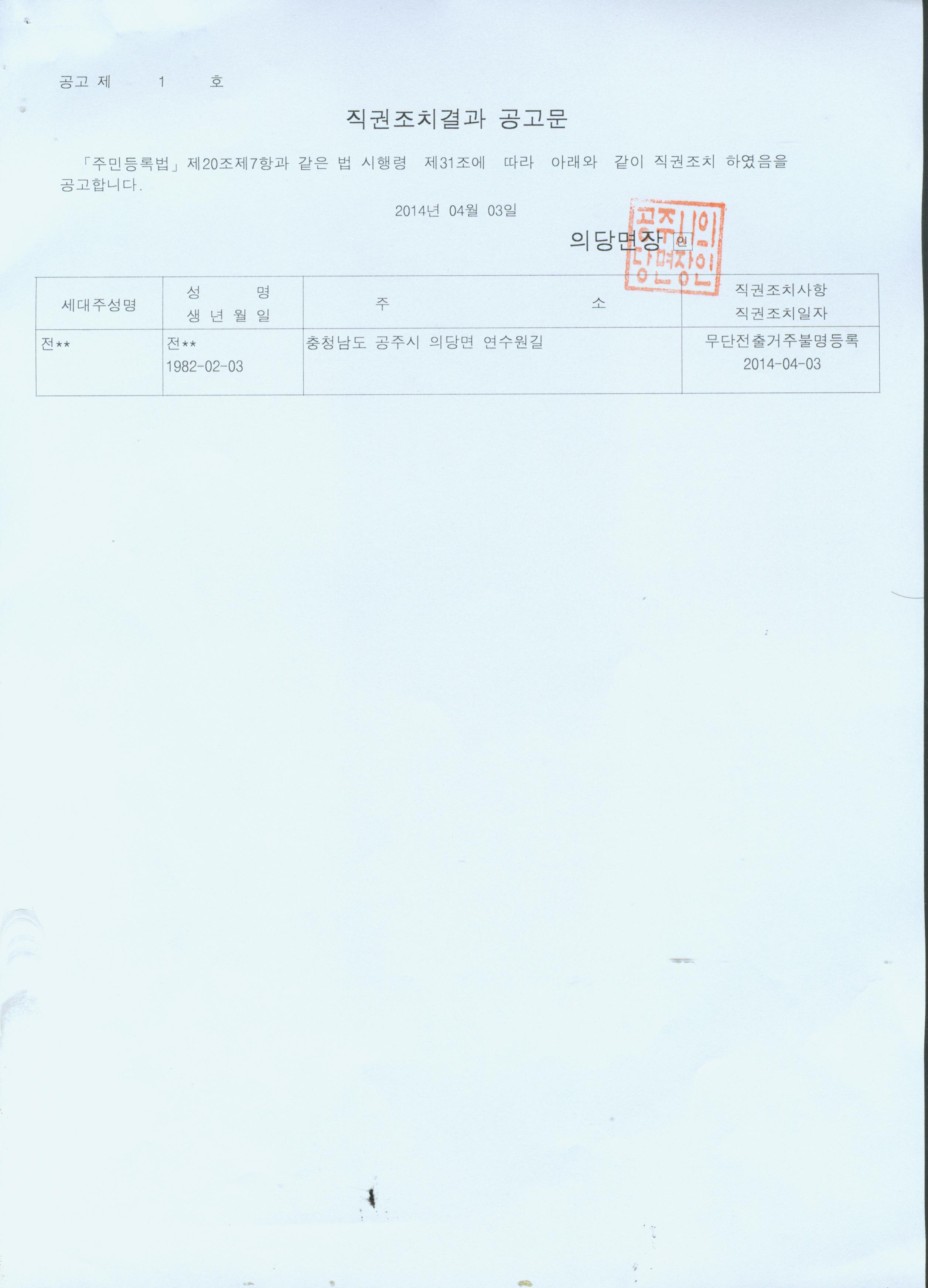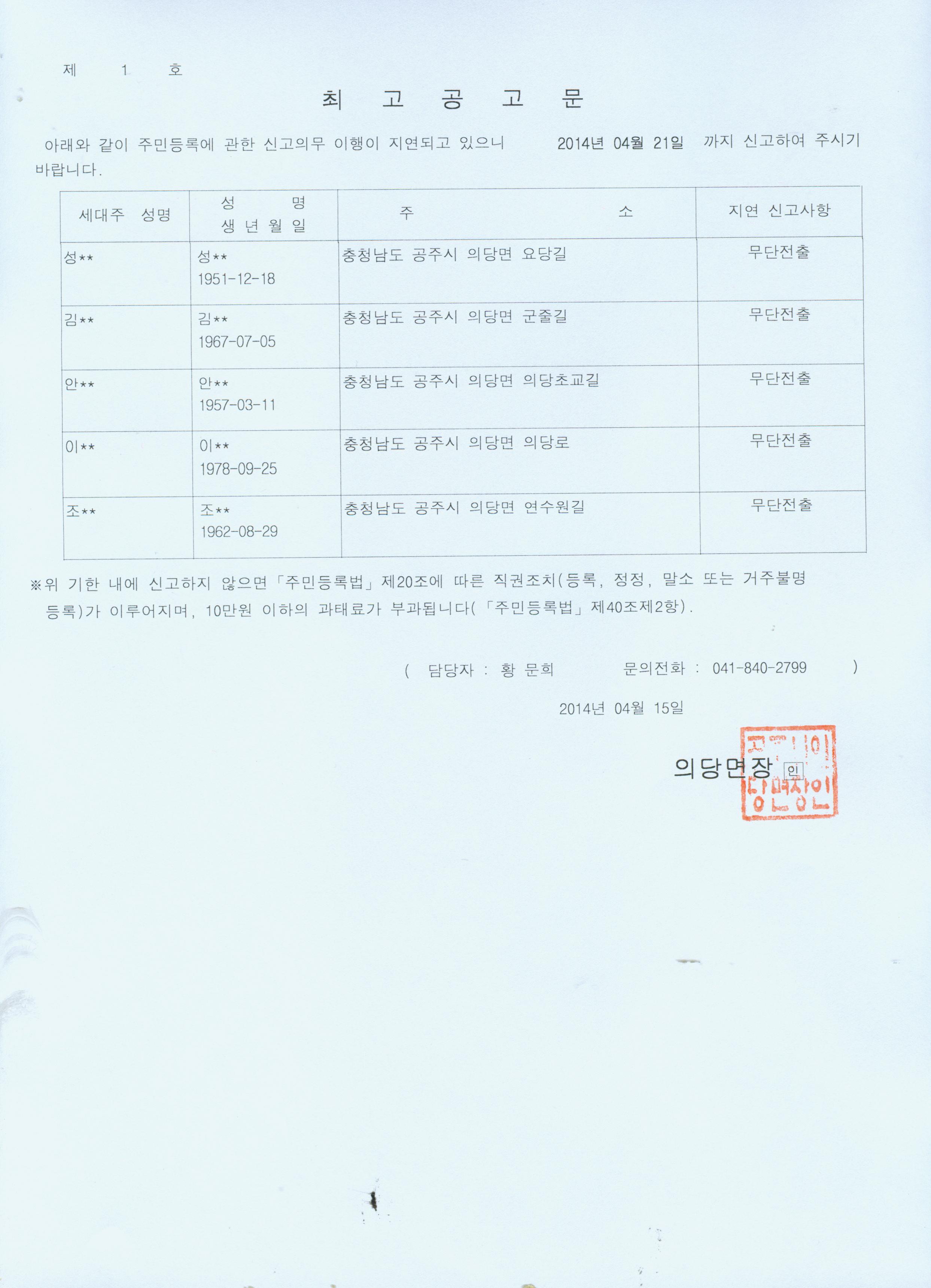 | 133 | 주민등록 무단전출자에 대한 최고공고 | 의당면 | 1,284 | 2014-04-15 | 최고공고문.jpg |