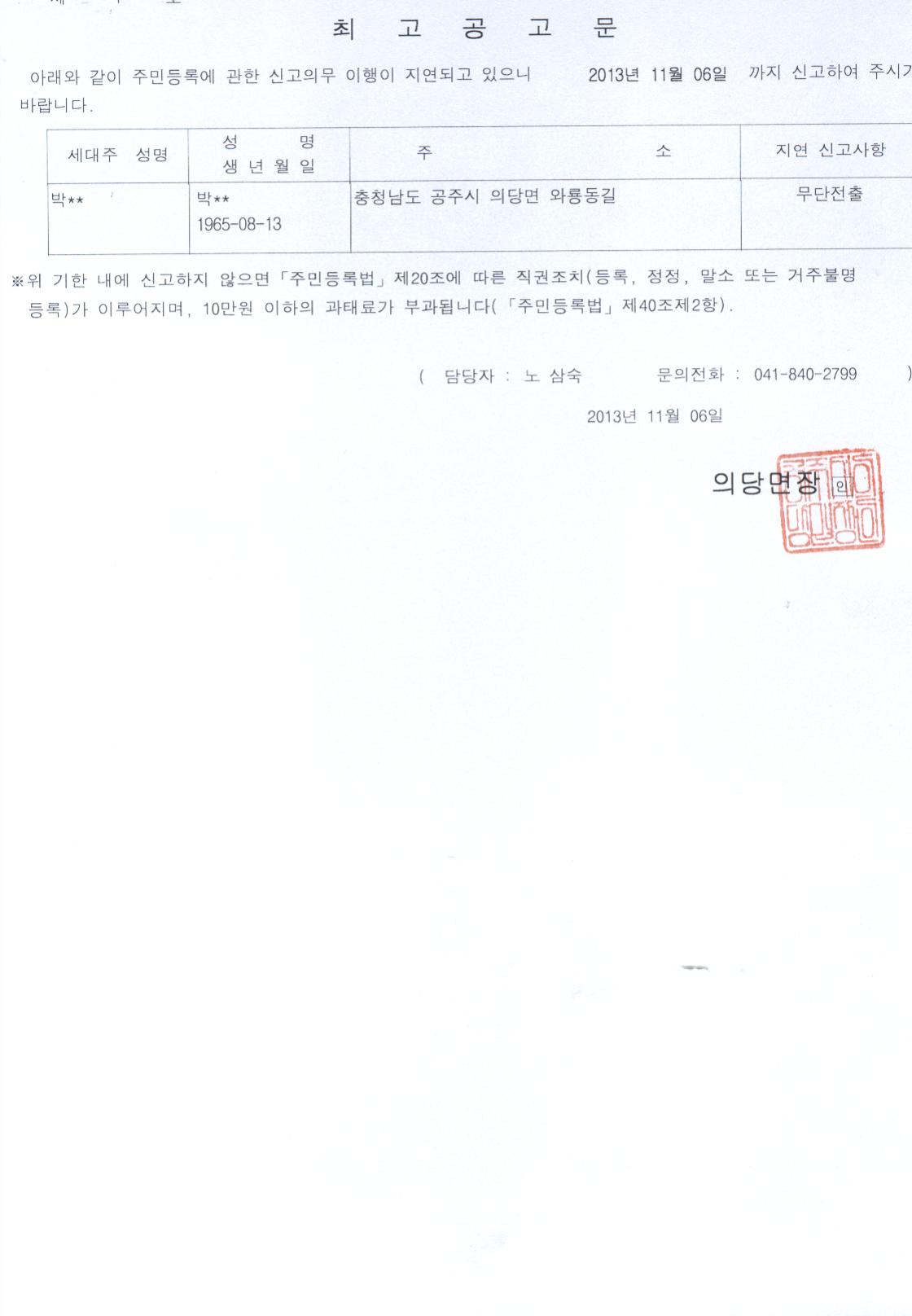| 123 | 주민등록 무단전출자에 대한 최고공고문 | 의당면 | 1,496 | 2013-10-28 | 최고 공고문.jpg |