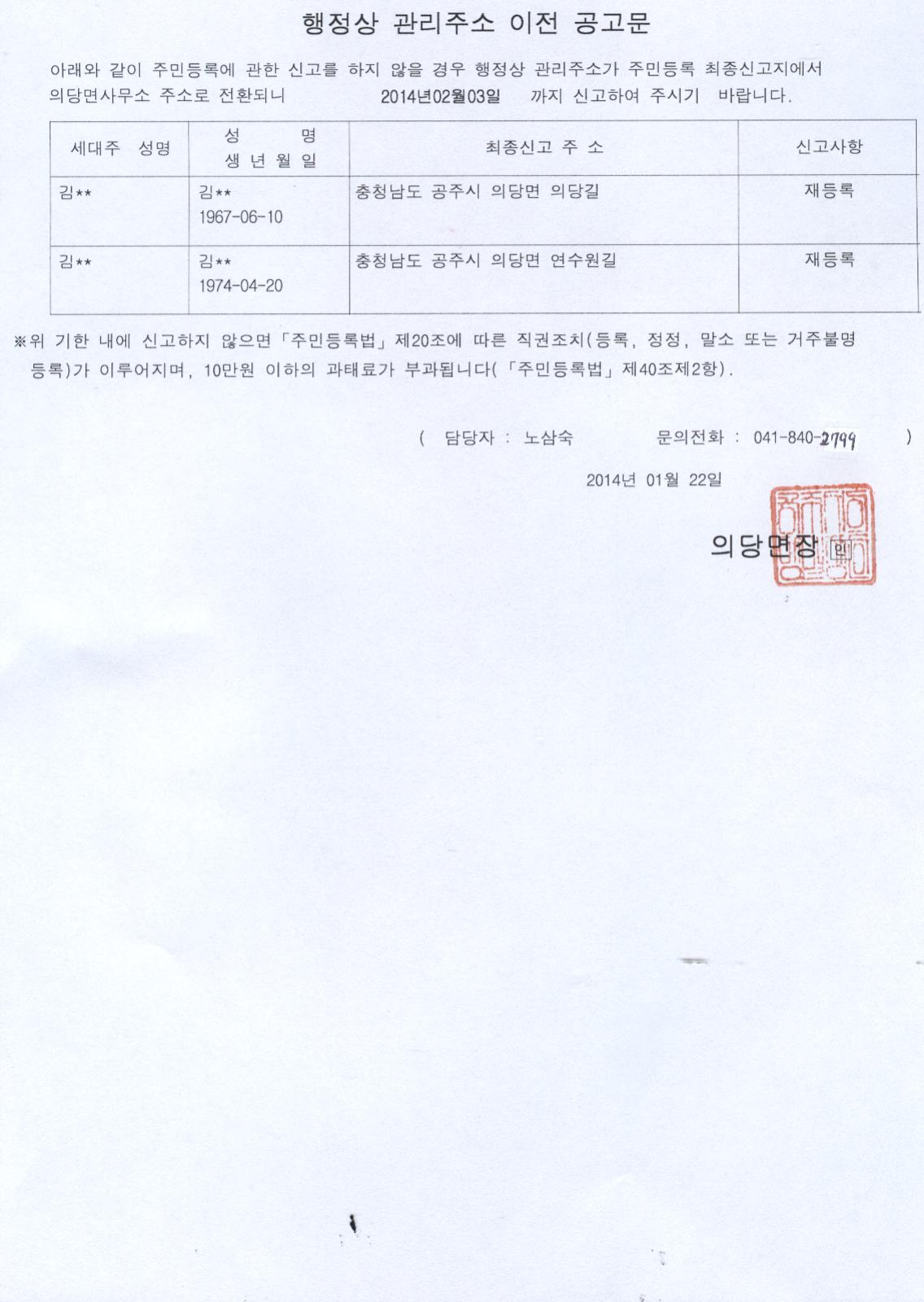 | 127 | 행정상 관리주소 이전 공고문 2차 | 의당면 | 1,270 | 2014-02-04 | 행정상 주소이전공고 2차.jpg |