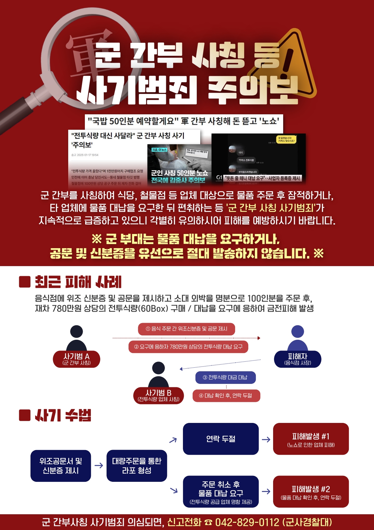 | 1459 | 군 간부 사칭, 민간업체 대상 사기범죄 피해사례 안내 | 의당면 | 27 | 2025-03-30 | 사기범죄 주의보 (홍보포스터)_1.jpg |