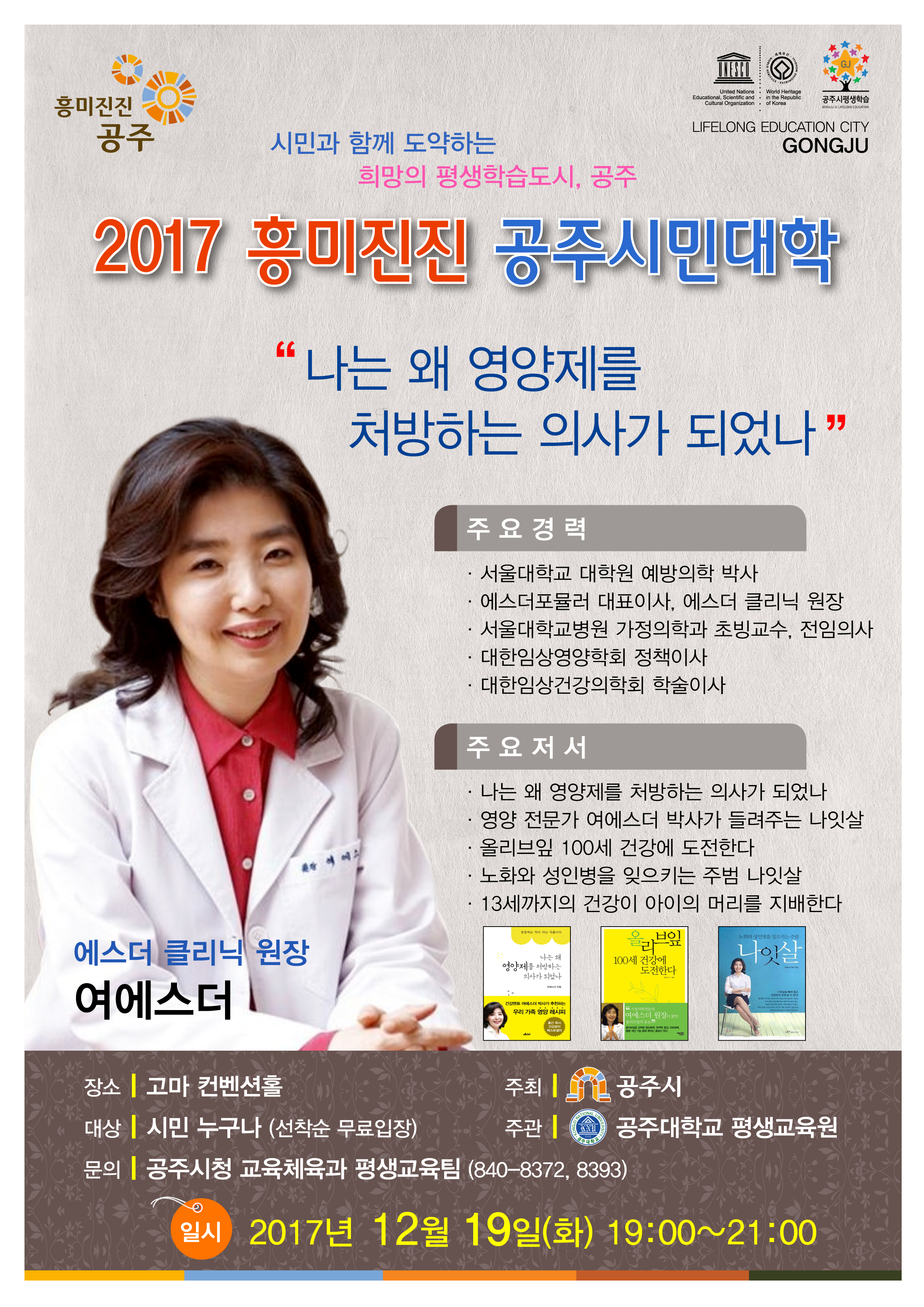 | 580 | 흥미진진 공주시민대학 제40강 교양강좌(에스터 클리닉 원장 여에스더) 안내 | 총무 | 277 | 2017-12-06 | 에스더-전단지.jpg |