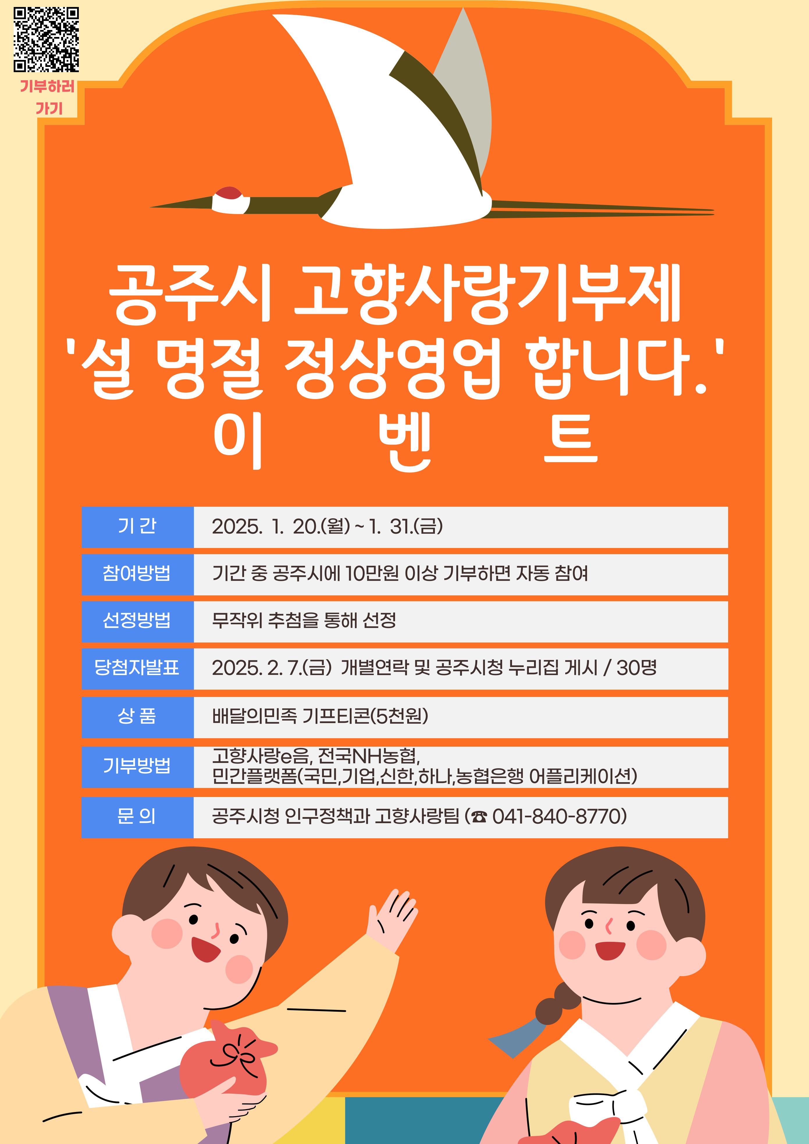 | 381 | 공주시 고향사랑기부제 '설 명절 정상영업 합니다.' 이벤트 | 우성면 | 105 | 2025-01-20 | 고향사랑기부제 이벤트.jpg |