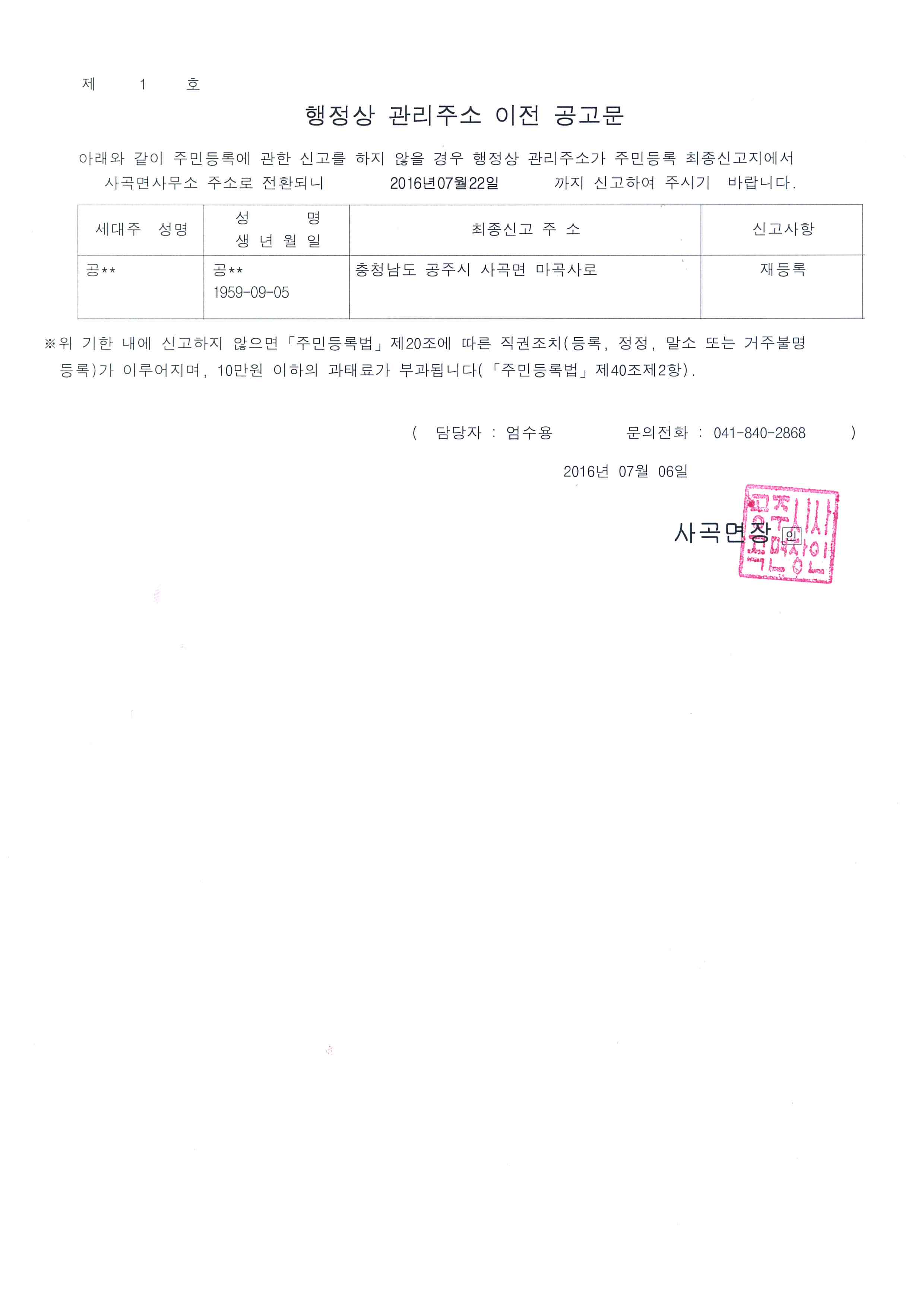 | 261 | 행정상 주소이전 공고(2차) | 사곡면 | 1,181 | 2016-07-06 | 행정상주소이전(2차)공고문.jpg |
