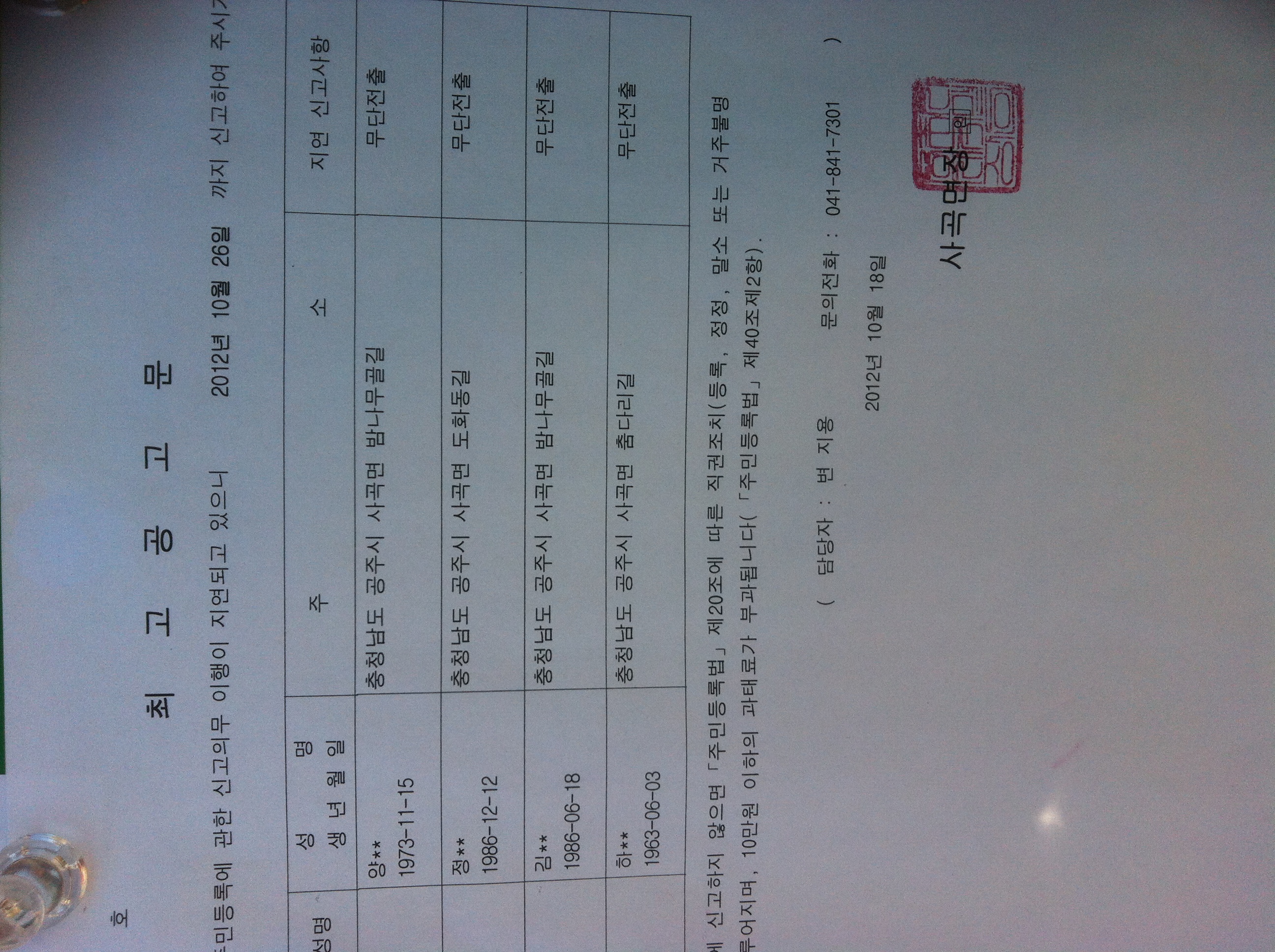 | 166 | 주민등록신고 불이행자 직권조치결과 공고 | 관리자 | 1,124 | 2012-11-08 | 공고문 (1).jpg |