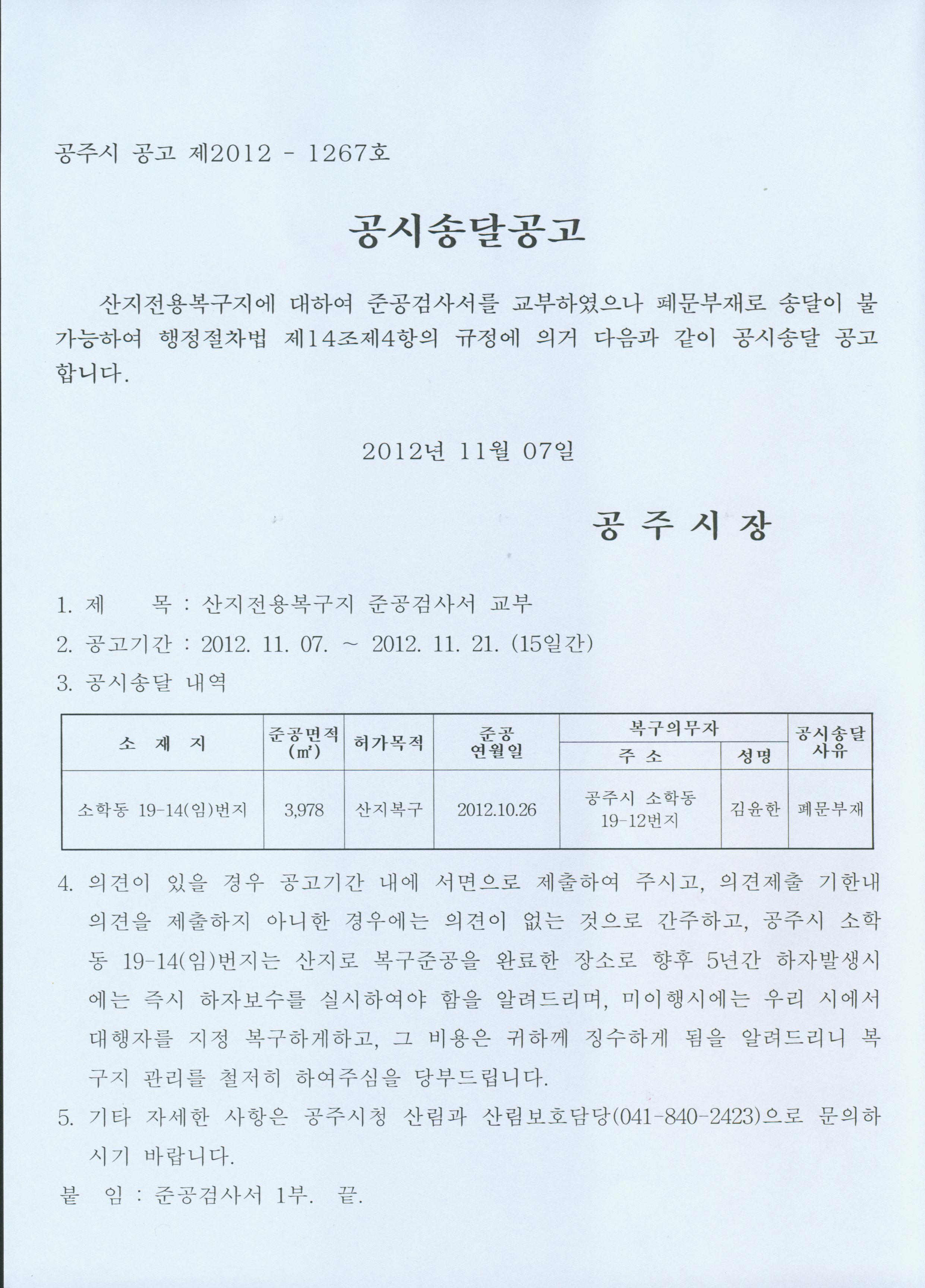 | 165 | 산지전용 복구지 준공검사서 교부 공시송달 공고문 게시 | 관리자 | 1,358 | 2012-11-07 | 공시송달공고.jpg |